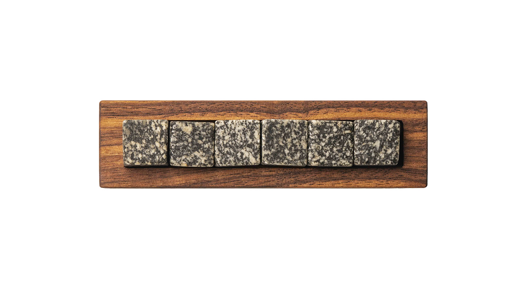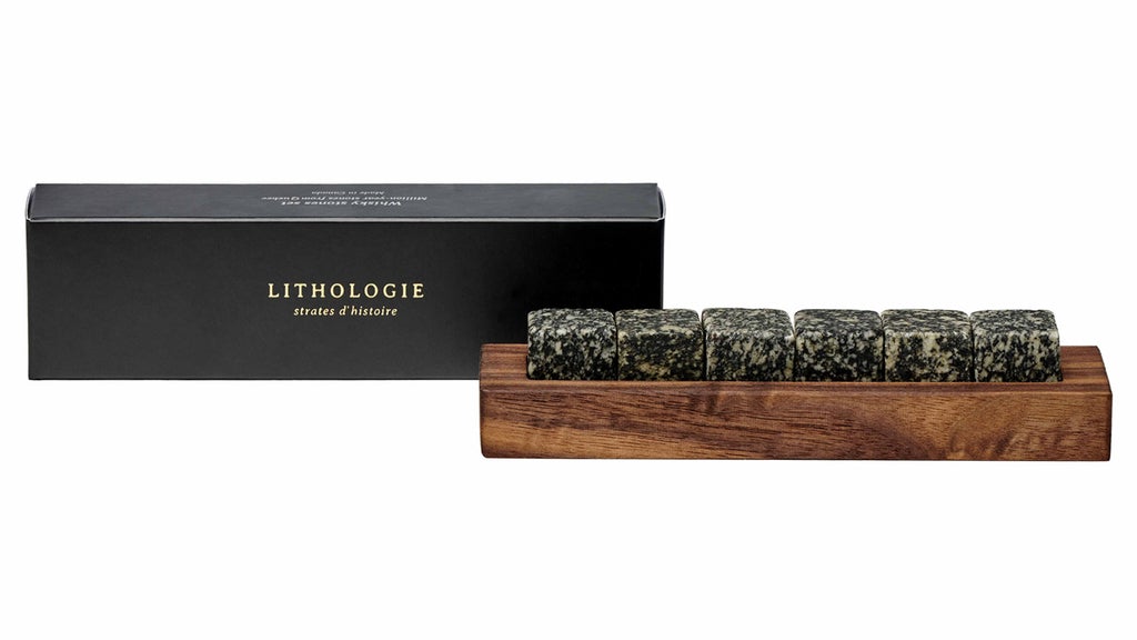 Cet ensemble de pierres à whisky contient 6 pierres avec un plateau en noyer avec des pierres de 2,5 milliards d'années de la région de Chibougamau, Qc, Canada.