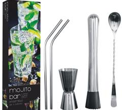 Ensemble de 5 outils pour Mojito, en acier inoxydable. Comprend: 2 pailles en inox réutilisables, pilon à cocktail, doseur double, et cuillère à cocktail. Boîte cadeau de style de livre.