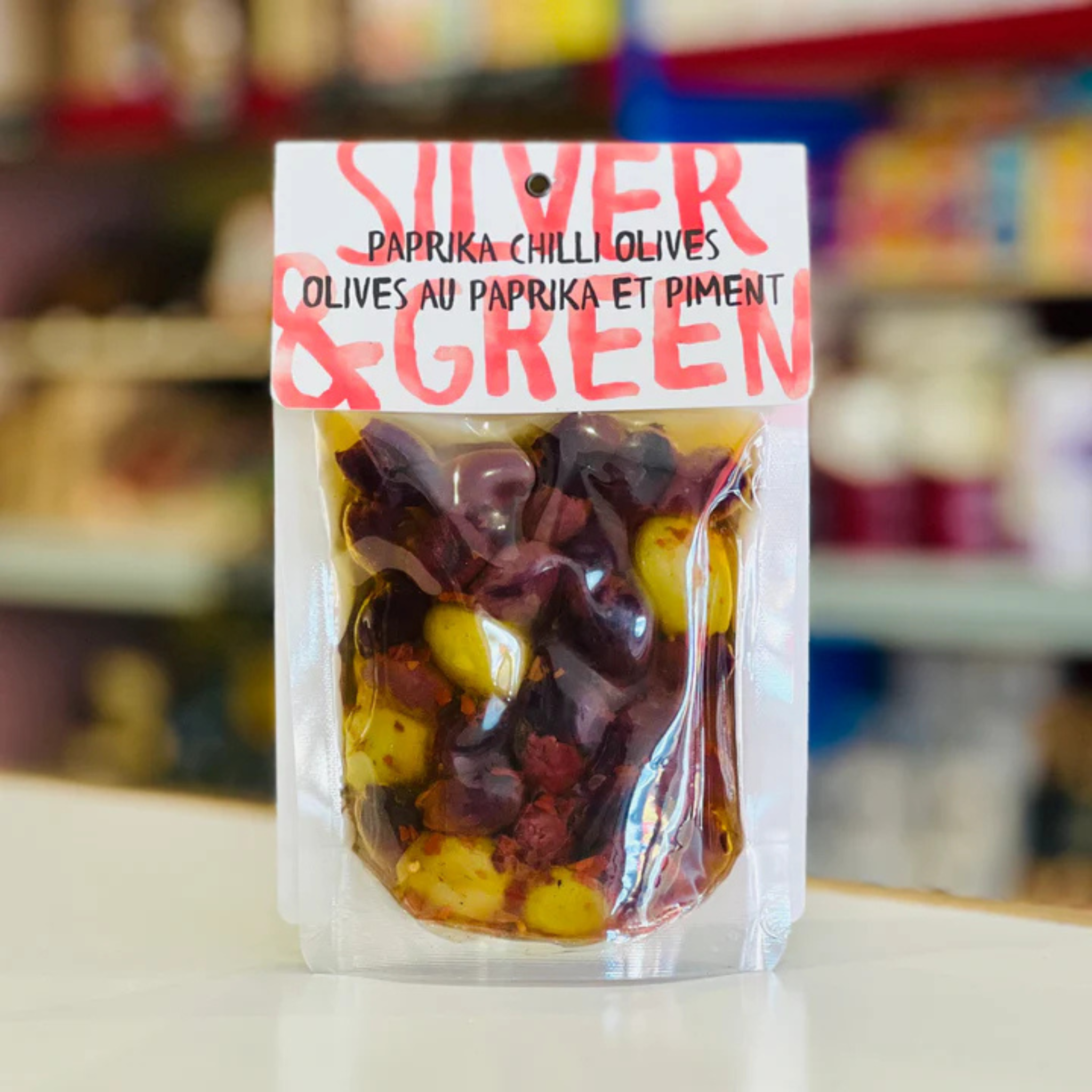 Silver & Green prépare toutes ses olives marinées à partir des variétés grecques Kalamata et Halkidiki. Ces olives sont marinées dans de l'huile de tournesol avec du paprika fumé espagnol et des flocons de piment, offrant une saveur intense et légèrement épicée.