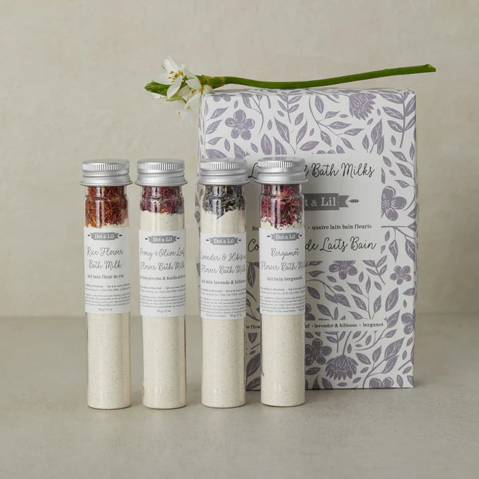 Ce coffret cadeau est présenté dans une magnifique boîte à deux pièces contenant 4 grands flacons de lait bain, que vous pouvez utiliser individuellement ou mélanger pour créer un bain personnalisé. Chaque tube contient des pétales de fleurs pour un bain botanique sur mesure.