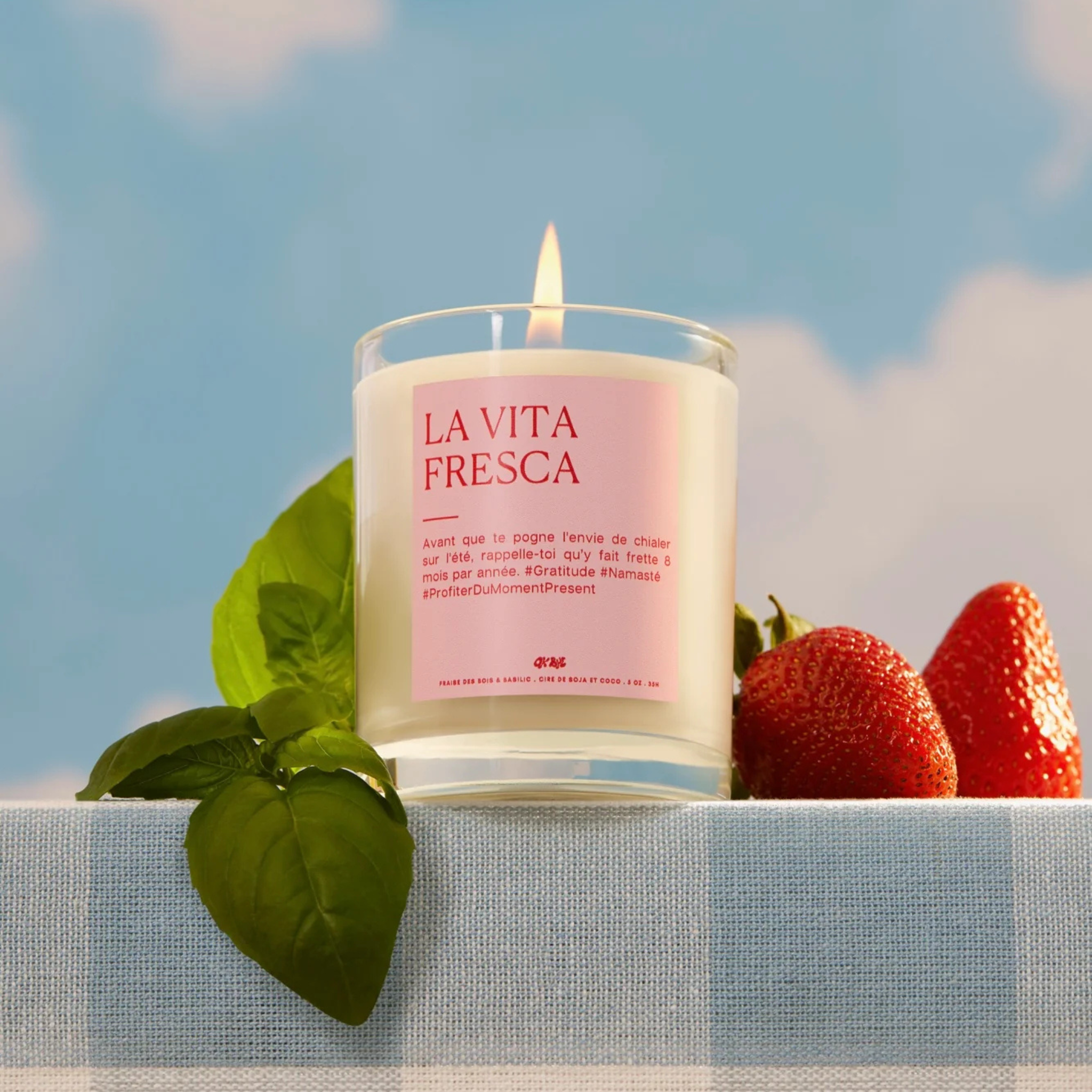 Une bouffée de soleil et de jardin, parfaite pour profiter du moment présent (même quand il fait 40). Cette chandelle ultra-fruitée marie la douceur juteuse des fraises des bois à la fraîcheur verte du basilic, avec une touche acidulée de rhubarbe. L’été en pot, à respirer sans modération.