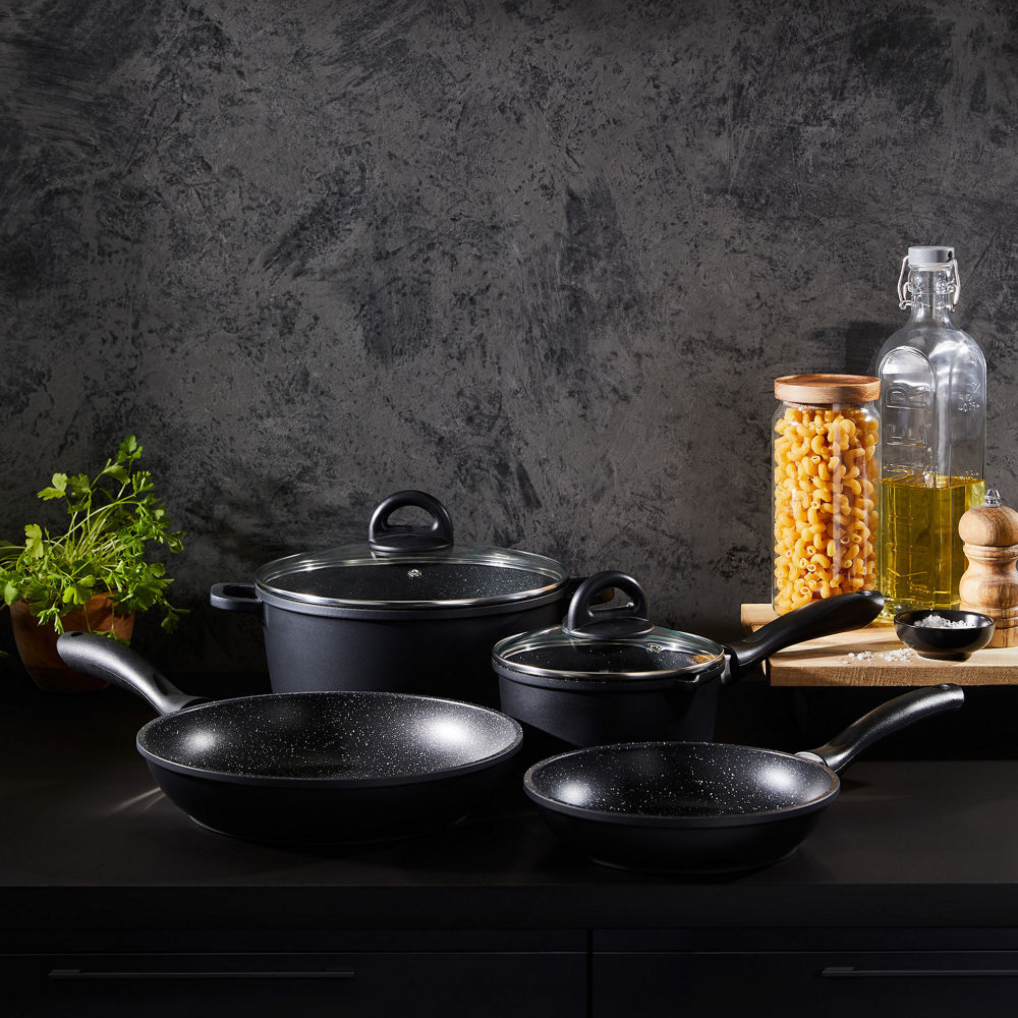 - Includes 4 essential pieces for the home chef: 20cm frying pan, 26cm frying pan, 16cm (1.4L) saucepan with glass lid, 24cm (4.3L) saucepan with glass lid