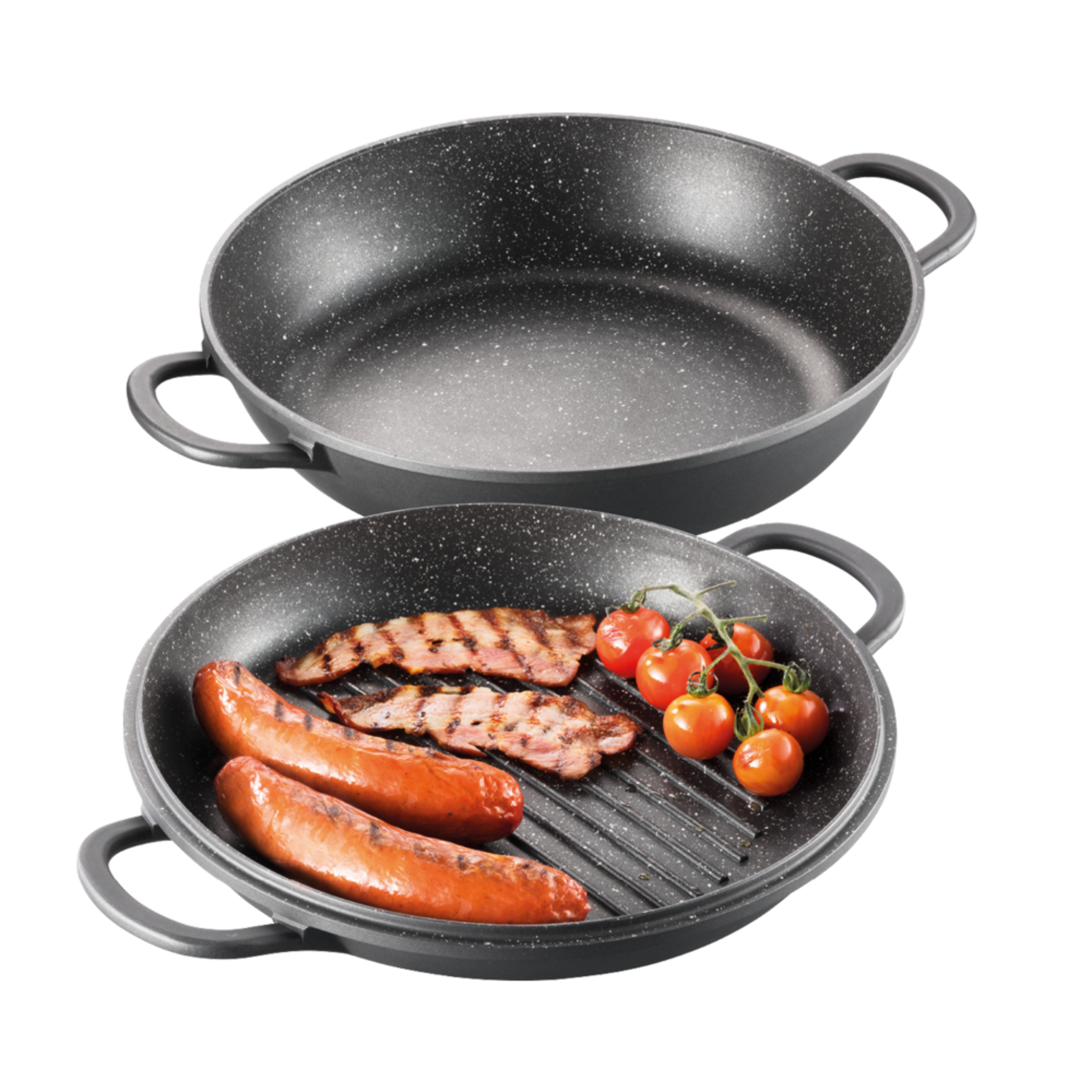 Whether you're grilling, frying, stewing, or roasting, the Cuisine::pro® STONE™ 30 cm Multi-Purpose Pan is the essential all-in-one utensil for every kitchen. With its 2-part design, the Cuisine::pro® STONE™ Multi-Purpose Pan can be used with its two halves together or separately, depending on the recipe. Create perfect grill marks on steaks, chicken, and vegetables with the grill side, or cook eggs, pancakes, and more with the flat side.