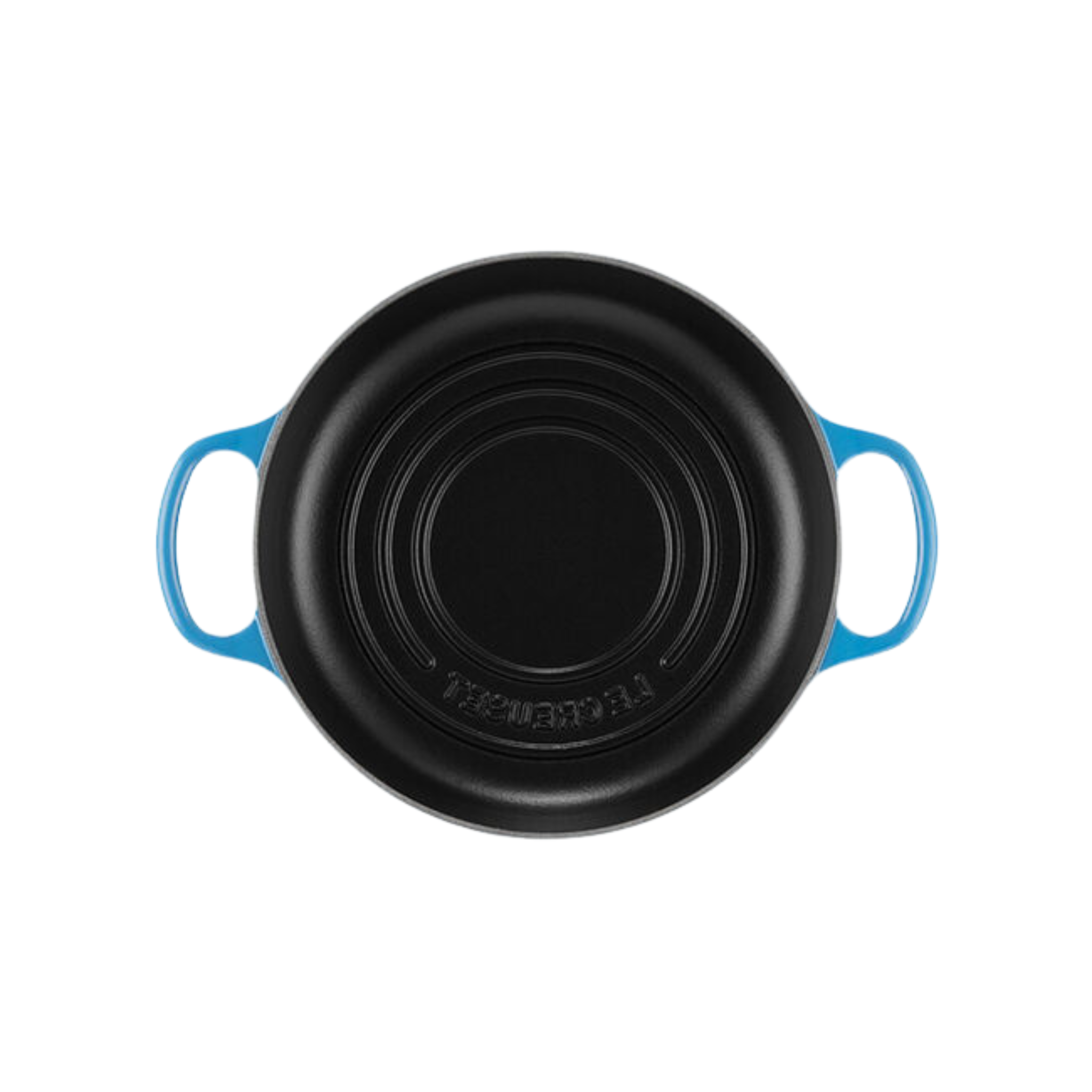 Designed to produce homemade bread with a golden crust and a perfectly soft interior, this enameled cast iron Dutch oven ensures excellent heat distribution. Its domed lid circulates steam for optimal rising, while its low-profile base guarantees even browning. The matte black enamel interior makes cleaning easy, and the ergonomic handles provide a comfortable grip. The base can also be used as a frying pan or roasting pan.