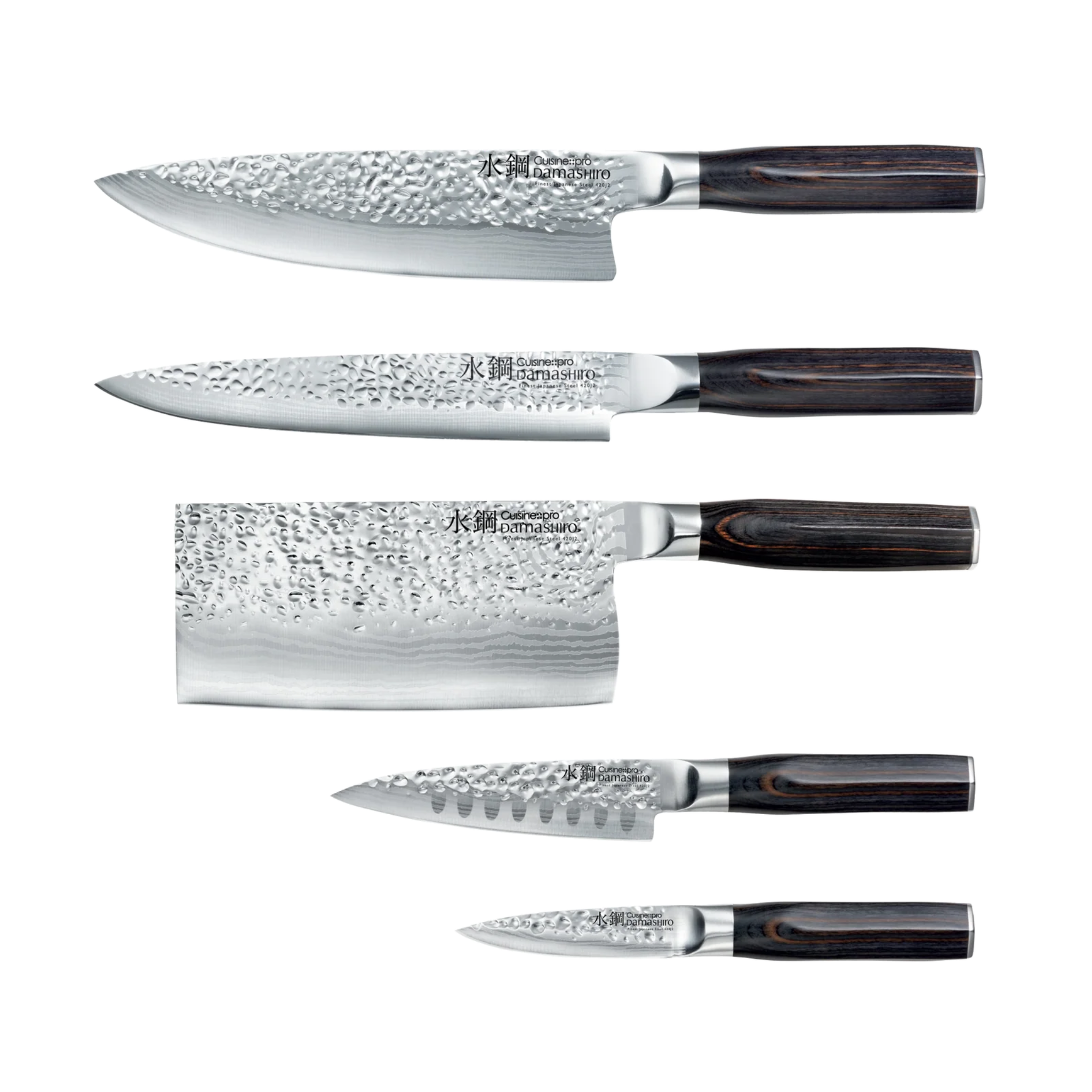 This 7-piece knife block brings together a comprehensive selection of premium knives made from Japanese 420J2 stainless steel. Each blade, with its tsuchime hammered finish, is presented on a tempered glass stand with pakkawood magnets to hold the knives in place.