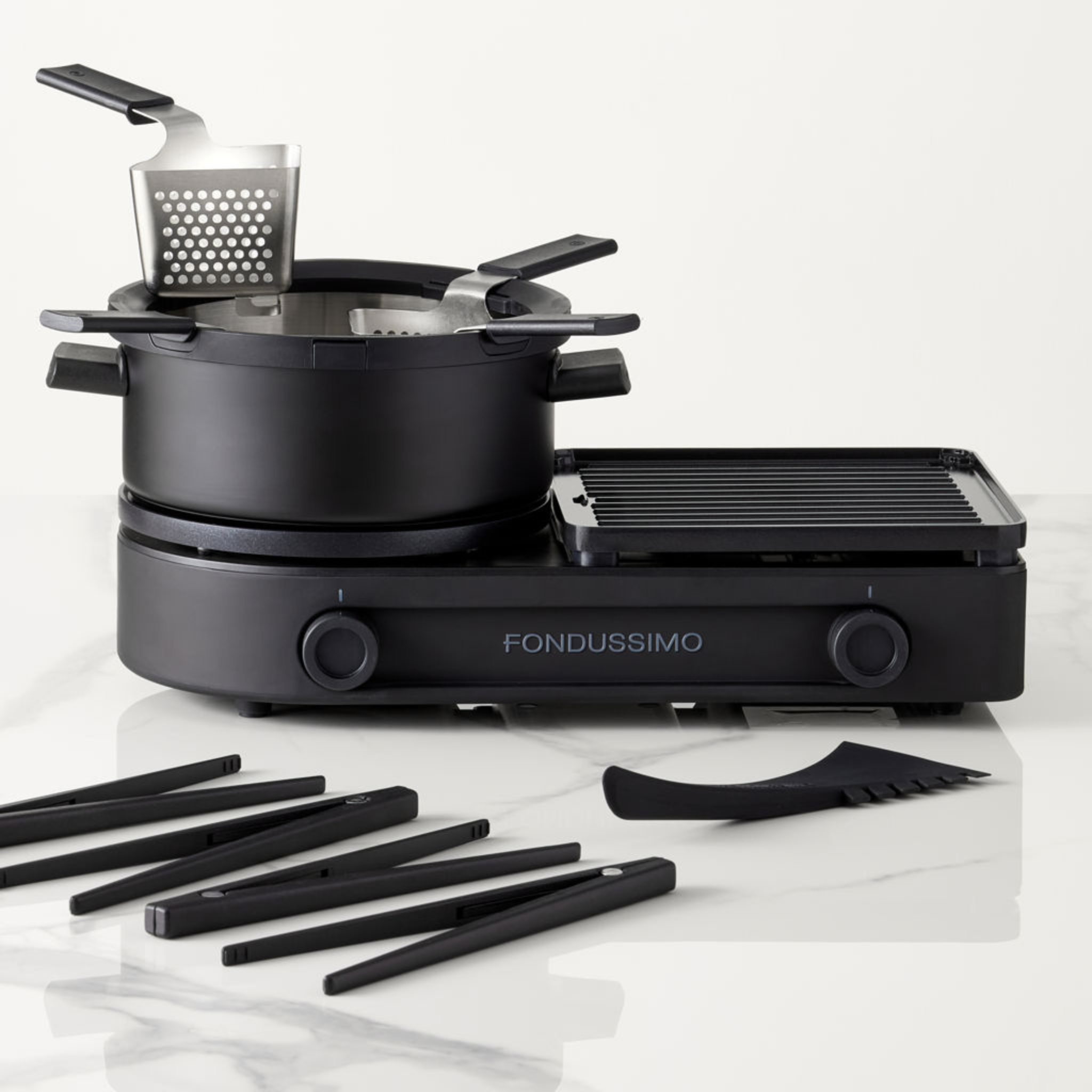 Two independent temperature controls provide precise control of the grill and fondue pot. The set includes a ceramic bowl for gentle bain-marie cooking, four stainless steel baskets, four serving tongs, and a multifunctional spatula scraper for easy maintenance. Its modern design and ease of use make it ideal for meals with family, friends, or festive evenings.