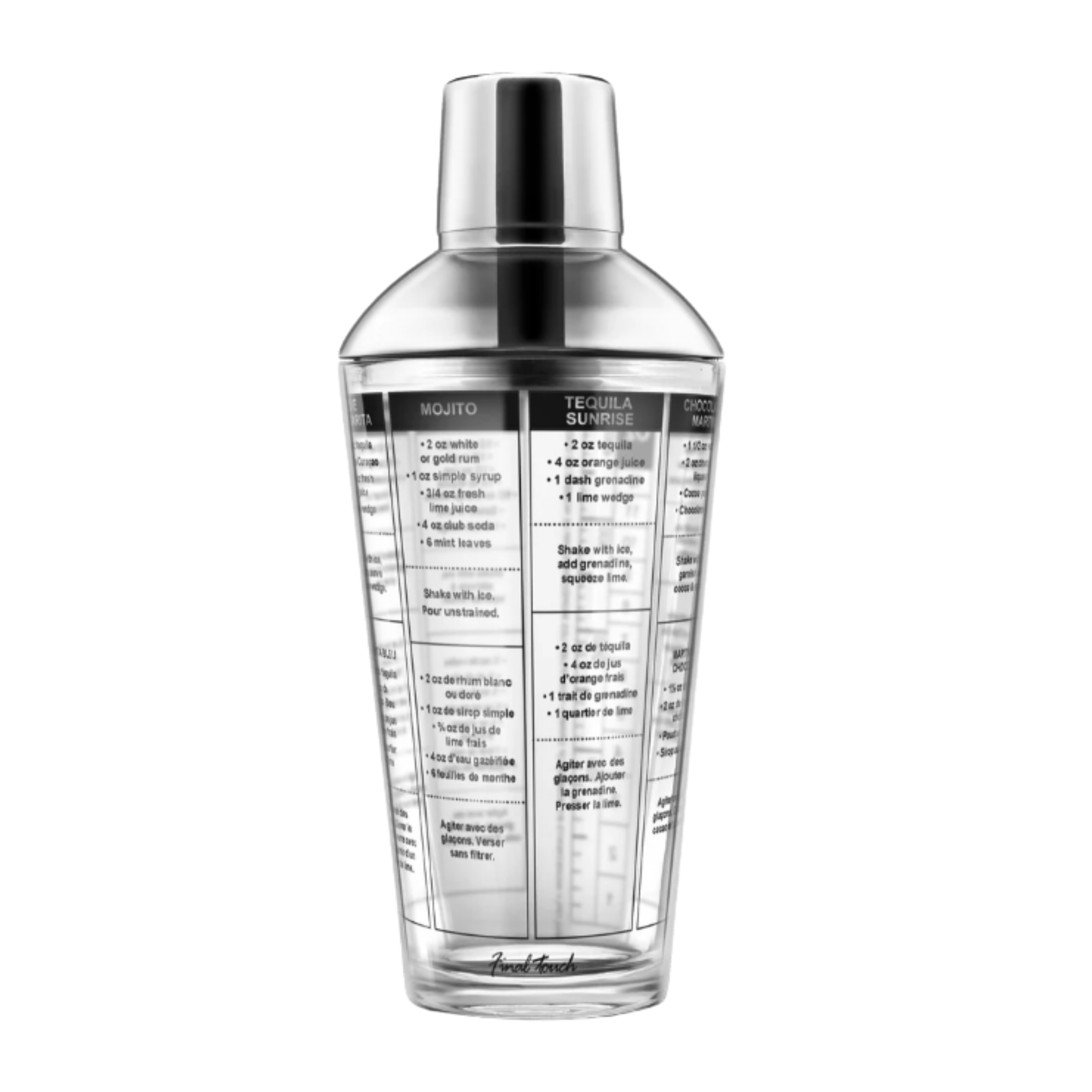 - 7 cocktail recipes printed directly on the shaker