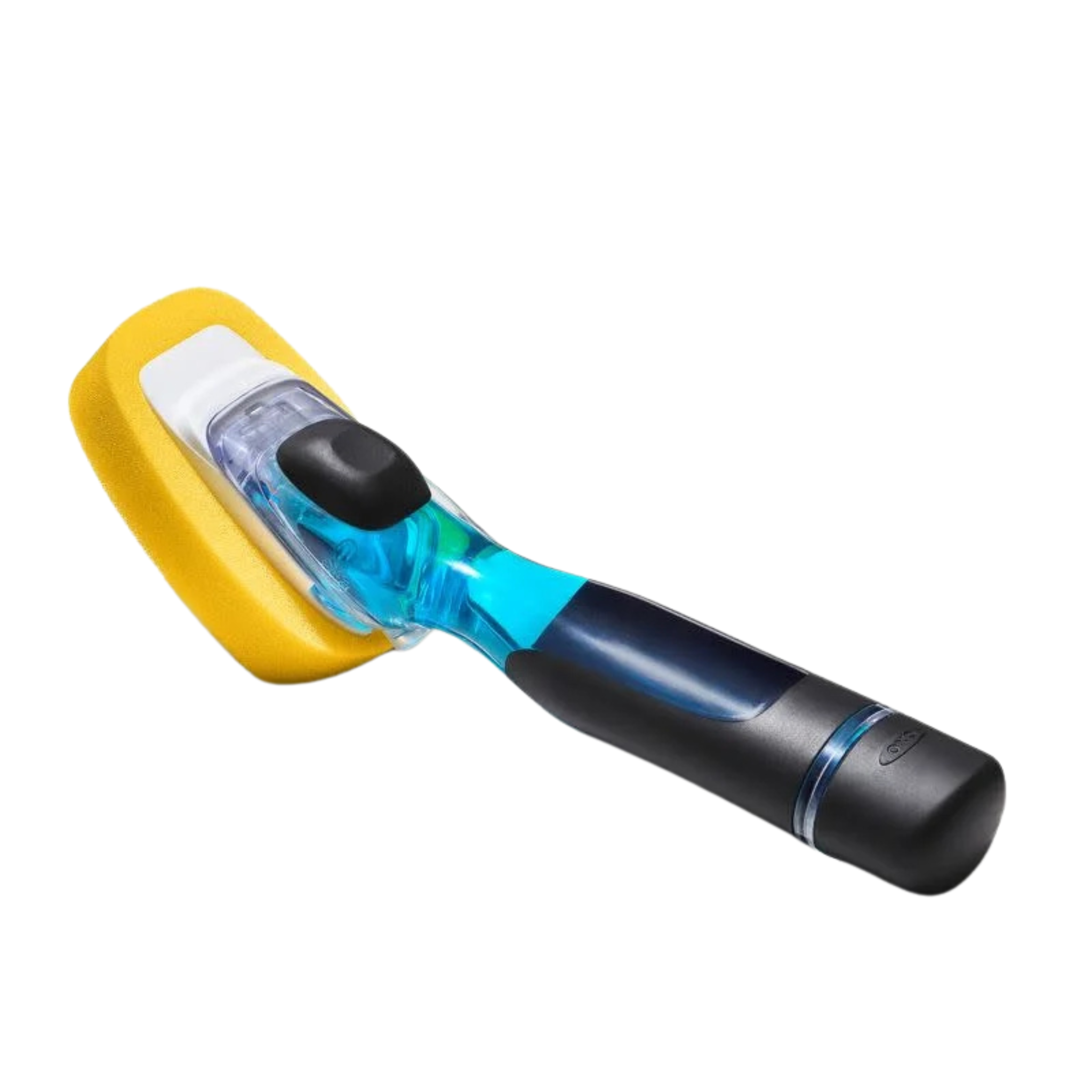 Simplify your dishwashing with this OXO Good Grips soap-dispensing sponge. With a simple push of the non-slip button, you release a dose of soap directly onto the dishes. The long, comfortable handle ensures a secure grip, even when wet. The durable FreshCel sponge cleans deep, even in nooks and crannies, and a built-in scraper on the back is ideal for stubborn residue. When the sponge wears out, easily replace it by pressing the tab.