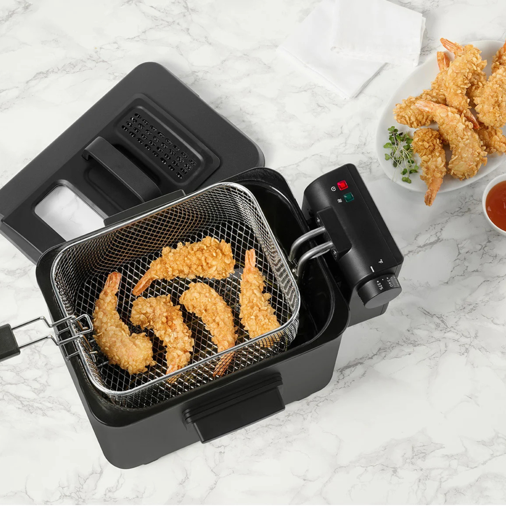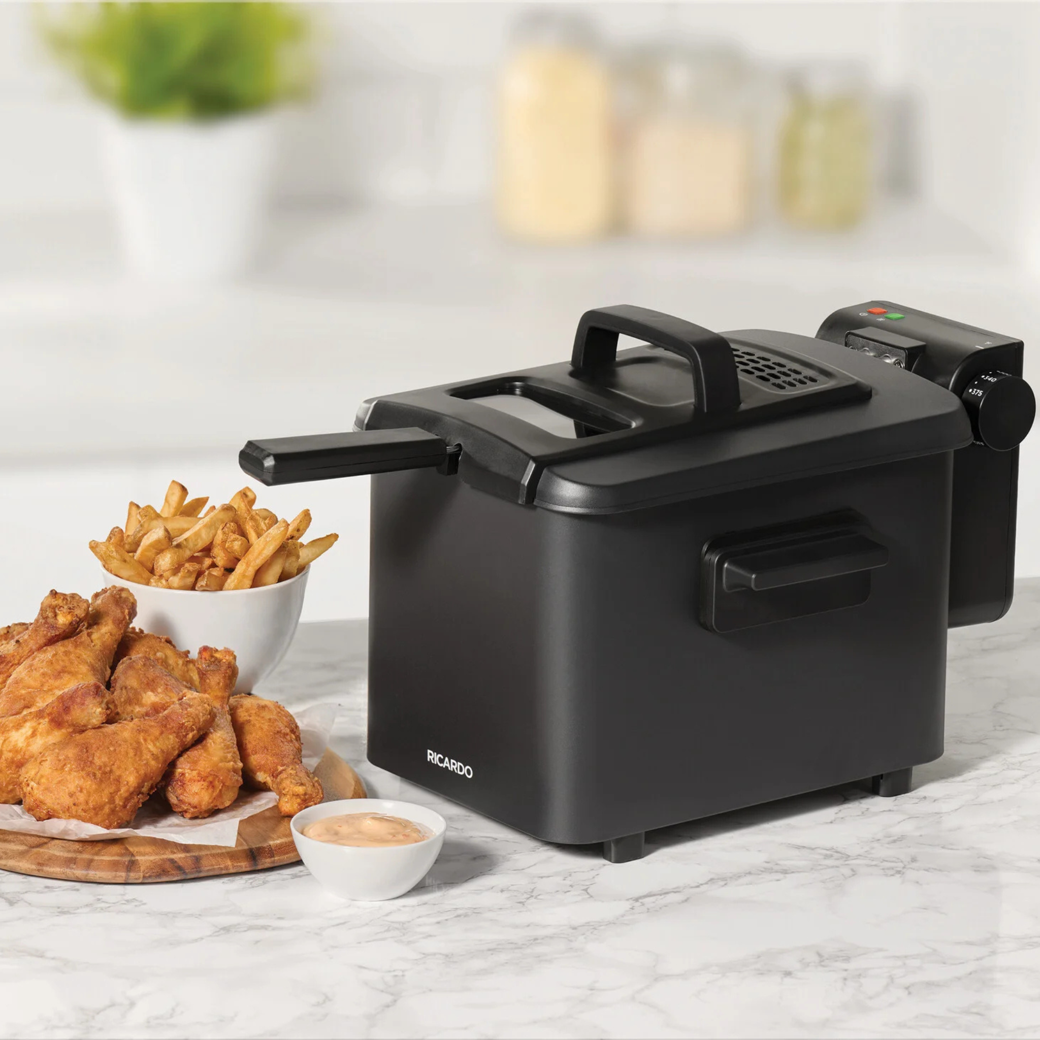 Easily create crispy, golden homemade fried foods with the Ricardo 3.5L deep fryer. Its powerful 1800W heating element ensures rapid preheating and even cooking, while the adjustable temperature from 135°C to 190°C allows for perfect cooking control. Practical and safe, it features cool-touch handles, a side control knob, and a cool zone that extends the life of your oil. The stainless steel basket and removable enamel bowl are dishwasher-safe for effortless cleaning.