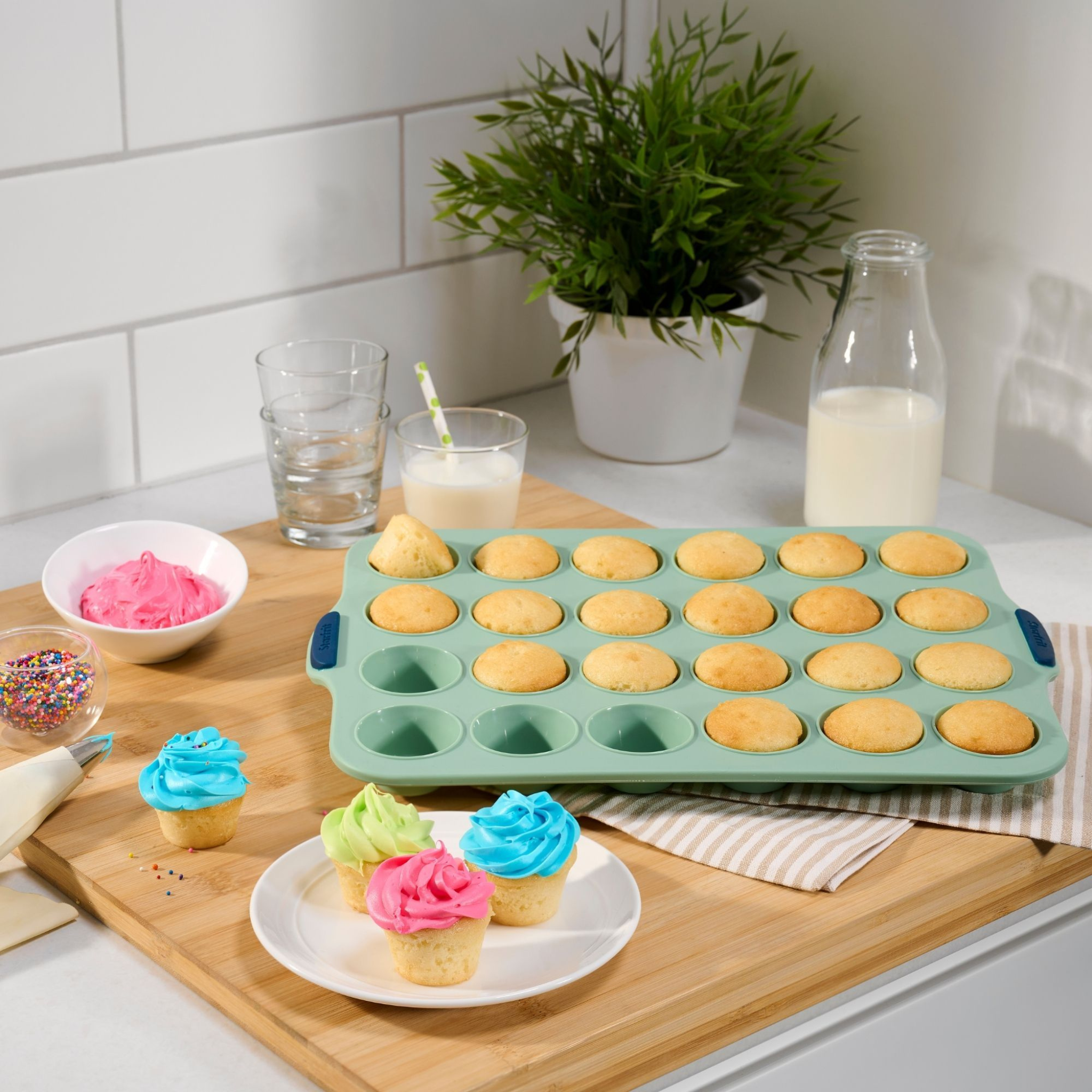Starfrit 24-cup silicone mini muffin pan with integrated metal structure, green