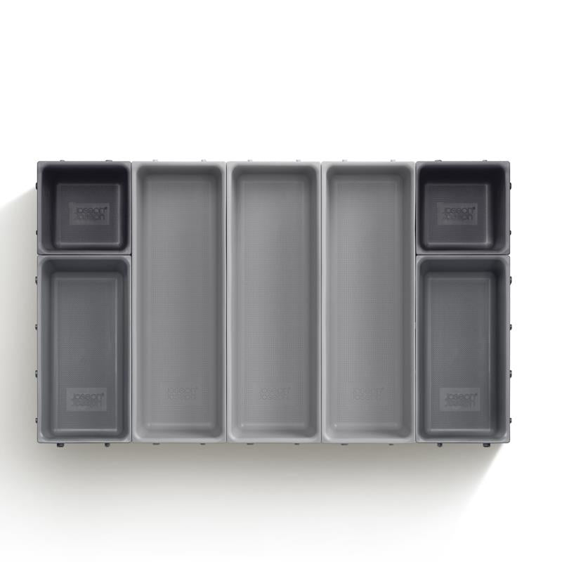 7-piece drawer organizer set, 15 x 26.5 x 9 cm H. This modular design includes individual trays of different sizes that can be clipped together on all sides for optimal drawer fit - they can also be divided and used in multiple drawers. Perfect for organizing and storing a wide range of household items such as cutlery, utensils, stationery, tools, and craft accessories. The set also comes with self-adhesive, non-slip feet.