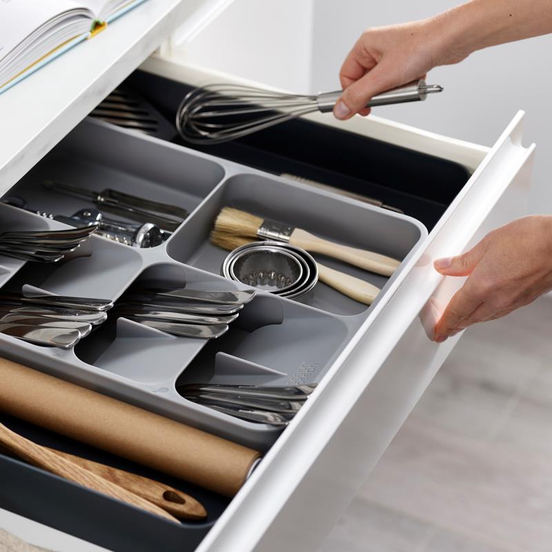 Expandable Cutlery, Utensil & Gadget Organizer, 39.5 x 31.5 x 5.5 cm H. Organize messy cutlery and utensil drawers with this highly practical storage solution. The unique design features five overlapping compartments for storing cutlery and two deep compartments for storing gadgets. The two sides of the tray can then be expanded on either side to create even more storage space for larger utensils and also to fit perfectly in your drawer. What is usually stored in two drawers can now be neatly organized in one, creating more space in your kitchen.