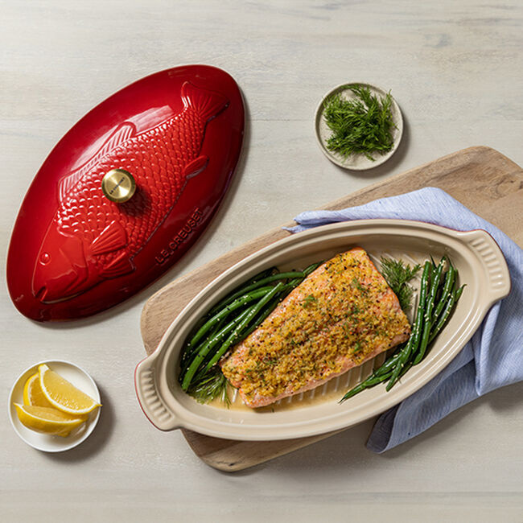 The fish dish is a covered oval baking dish, decorated with an elegant fish motif and a brushed gold knob. It is perfect not only for baking, roasting, and grilling all kinds of fish recipes, but also for roasting and steaming vegetables and meat, and much more.
