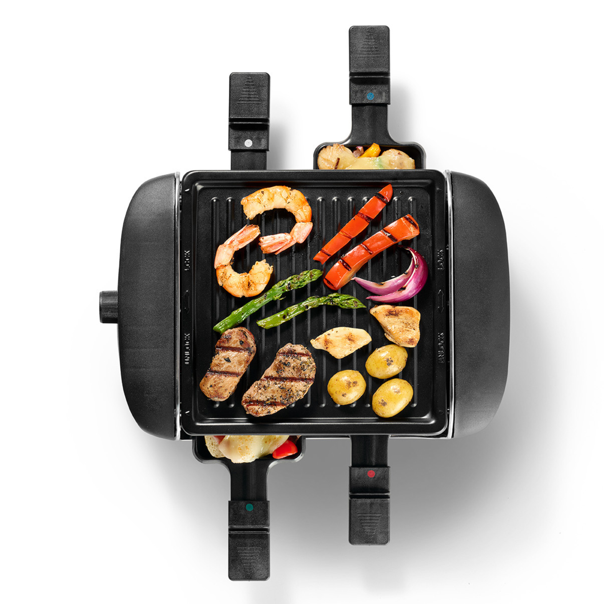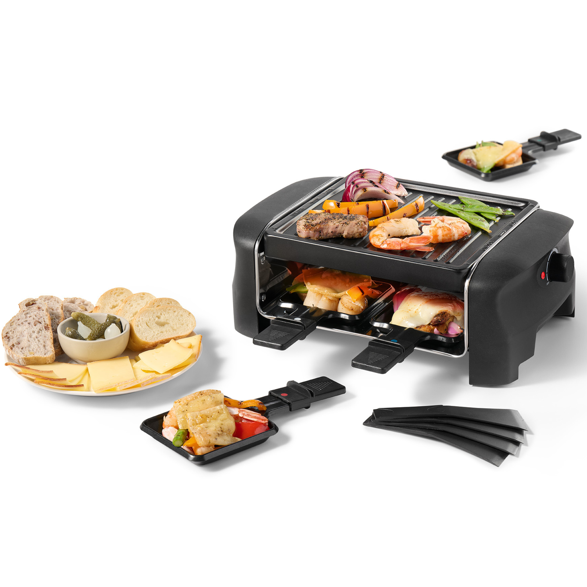 Raclette pan with grooved non-stick plate for convenient and even cooking. Allows you to prepare several small dishes simultaneously thanks to its 4 non-stick pans. Cool-touch handles and spatulas for safe use.