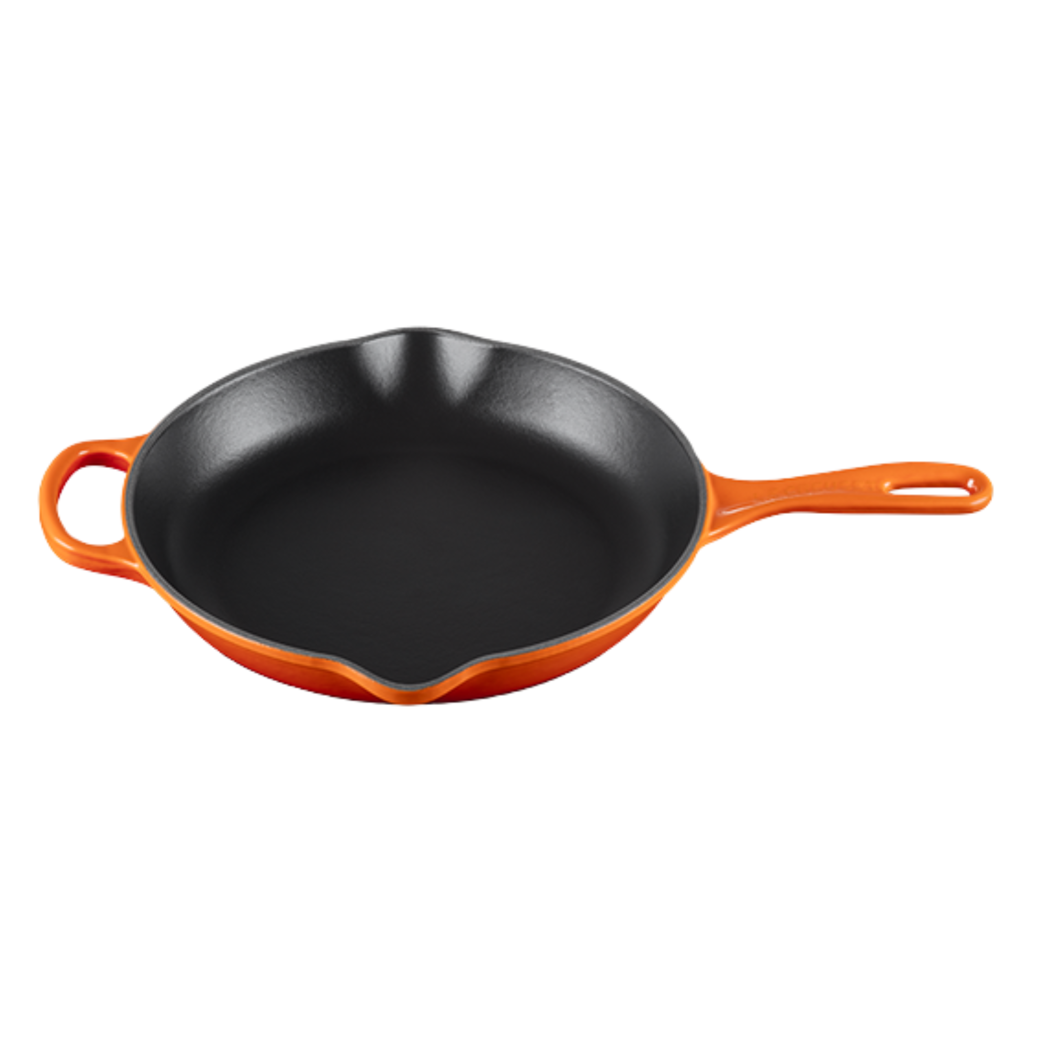 A kitchen essential, the Le Creuset enameled cast iron skillet provides optimal, even cooking for searing, frying, and roasting your food. Its satin black enamel interior develops a natural patina over time, improving cooking performance and allowing for a perfectly golden crust while maintaining a tender interior.