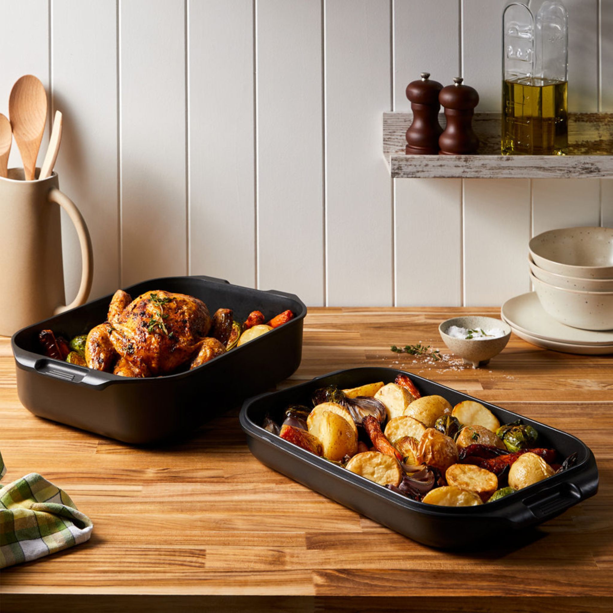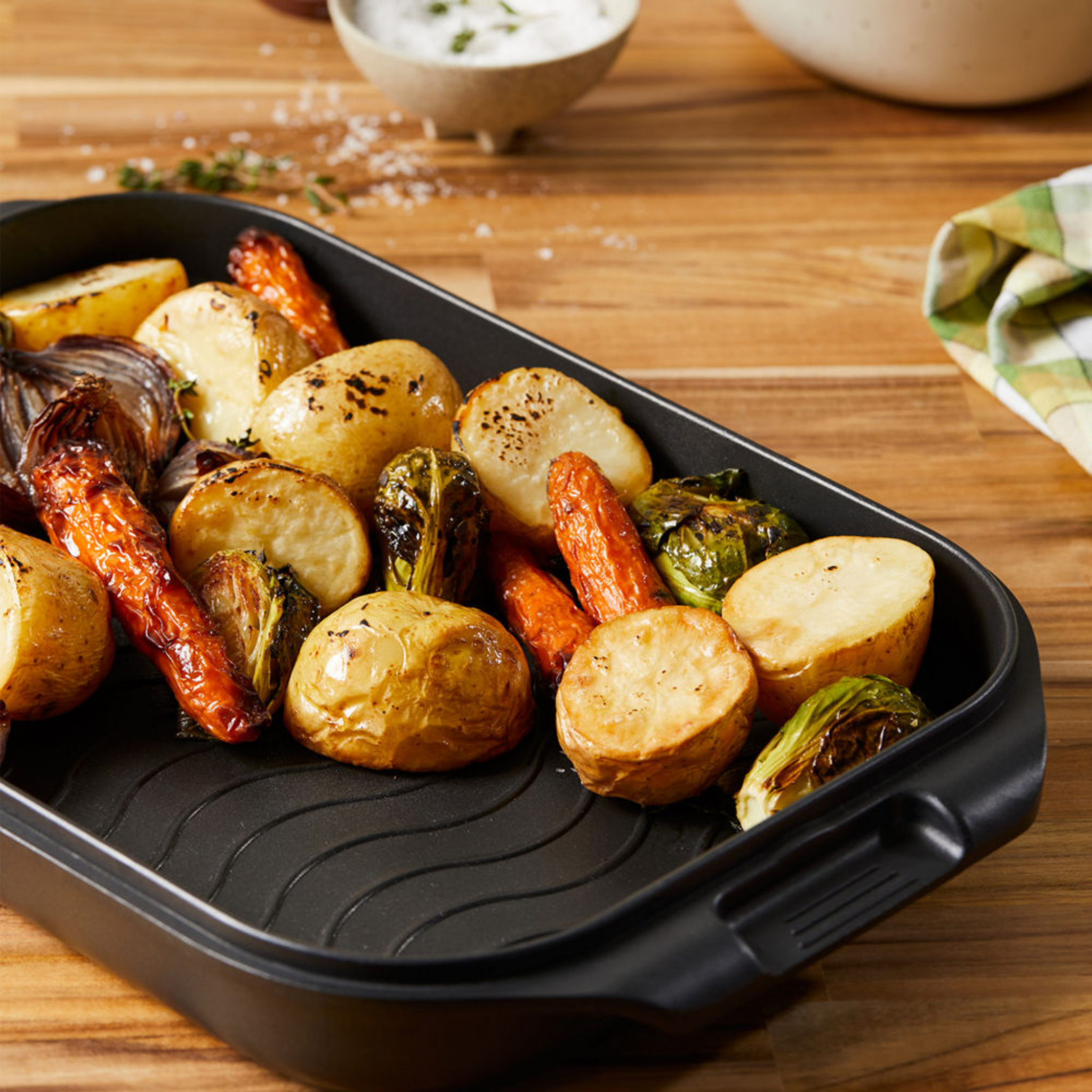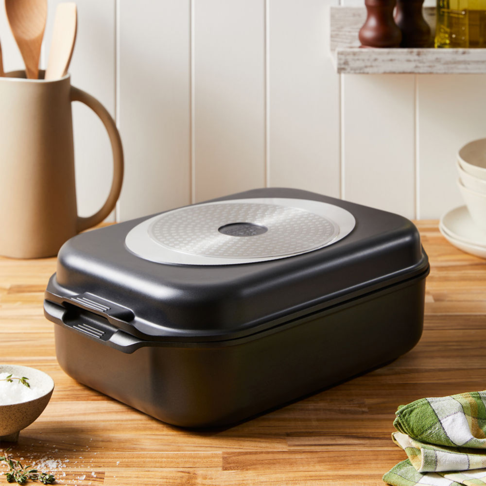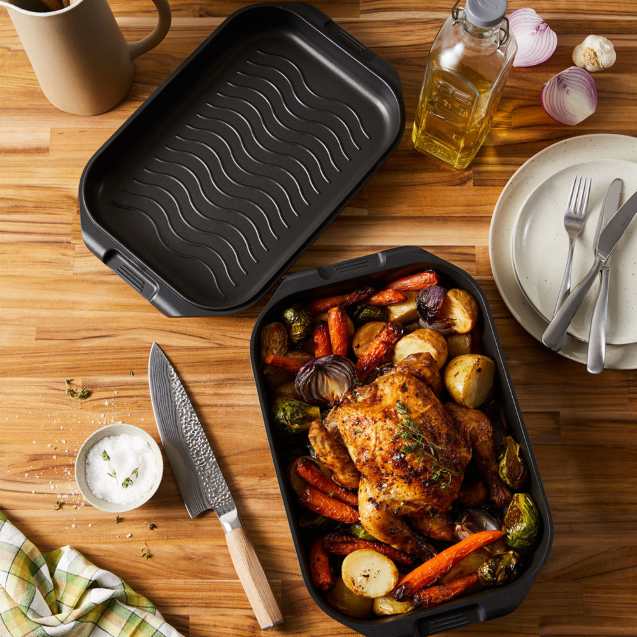Unleash your creativity in the kitchen and prepare a variety of delicious meals for your friends and family with the Cuisine::pro® iD3® 2-in-1 Rotisserie & Grill! This 2-piece cooking set is a must-have in every kitchen – its parts are designed to be used independently or together. The Cuisine::pro® iD3® 2-in-1 Rotisserie & Grill can be used to grill, fry, bake, and roast meat, fish, vegetables, and fresh produce in a healthy and tasty way. With fully bonded induction plates and a durable lid featuring raised ribs to create perfect grill lines on steaks and salmon, as well as a deep pan base for cooking the traditional Sunday roast, the Cuisine::pro® iD3® 2-in-1 Rotisserie & Grill is suitable for use in the oven up to 220°C or on electric, gas, ceramic, halogen, and induction hobs.