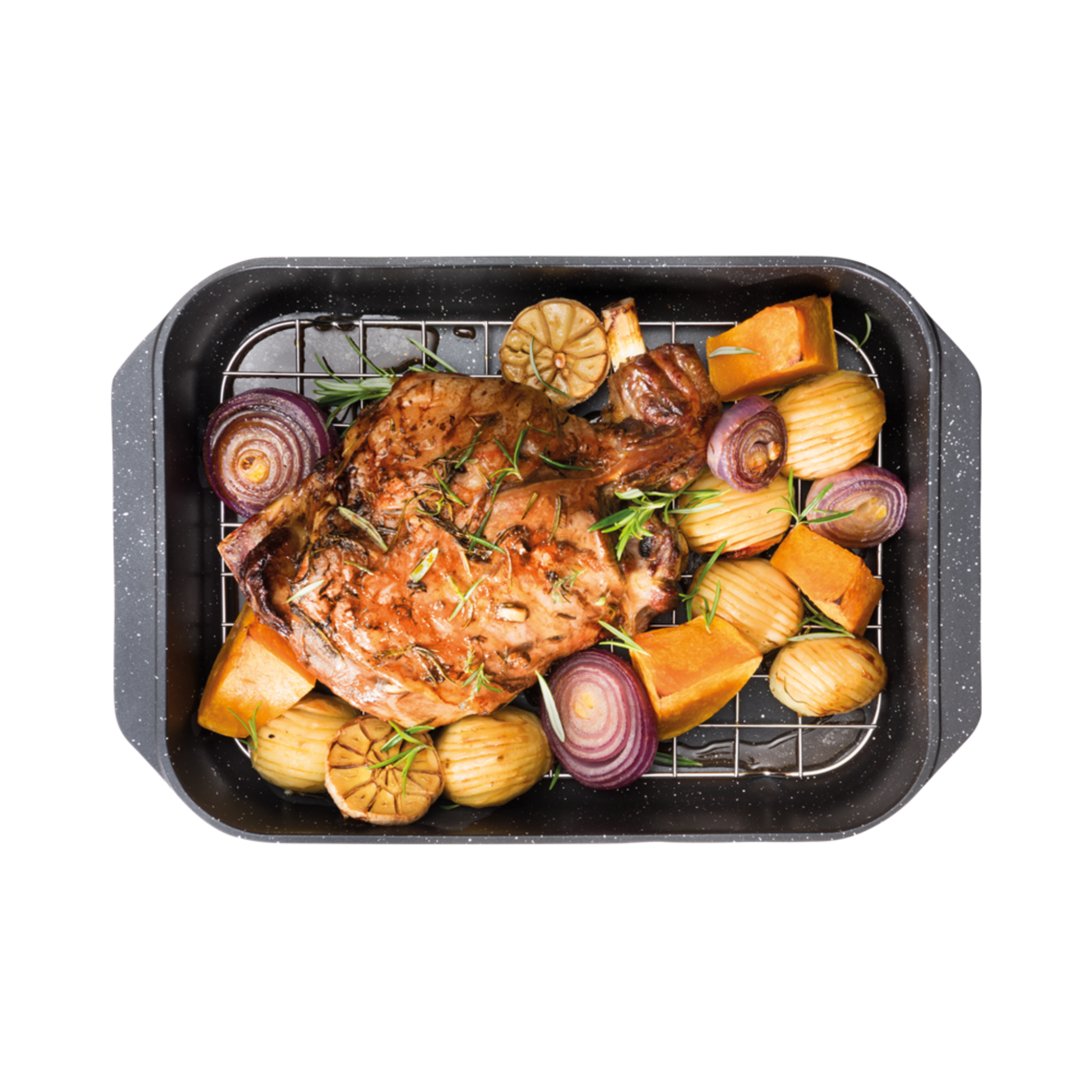 Prepare the Sunday roast with the Cuisine::pro® Granite® Non-Stick Roasting Pan! Perfect for roasting vegetables, meats, and more, this roasting pan features a stainless steel rack. Compatible with all hob types, including induction, it's designed for exceptional durability and a sleek design. Featuring a premium non-stick cooking surface, the Granite® Roasting Pan ensures food releases easily. This innovative surface allows for healthy, fat-free cooking while making cleanup super easy. Enhance your culinary collection and cook like a chef with the Cuisine::pro® Granite® Non-Stick Roasting Pan with Rack!