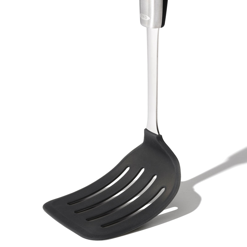 Spatula, 33 cm (13"), silicone and stainless steel. Features the strength and durability of a stainless steel spatula, but with a heat-resistant silicone head for scratch-free performance. The flexible head easily slides under fragile foods (like eggs, pancakes, and crepes), but is strong enough to handle whatever you're serving.