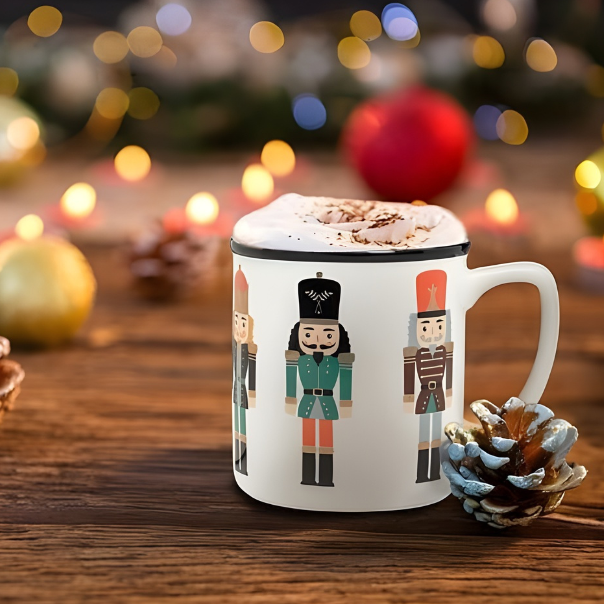 Add a touch of magic to your hot drinks with this festive mug featuring pastel nutcracker illustrations. Perfect for enjoying your coffee, tea, or hot chocolate during the holiday season.