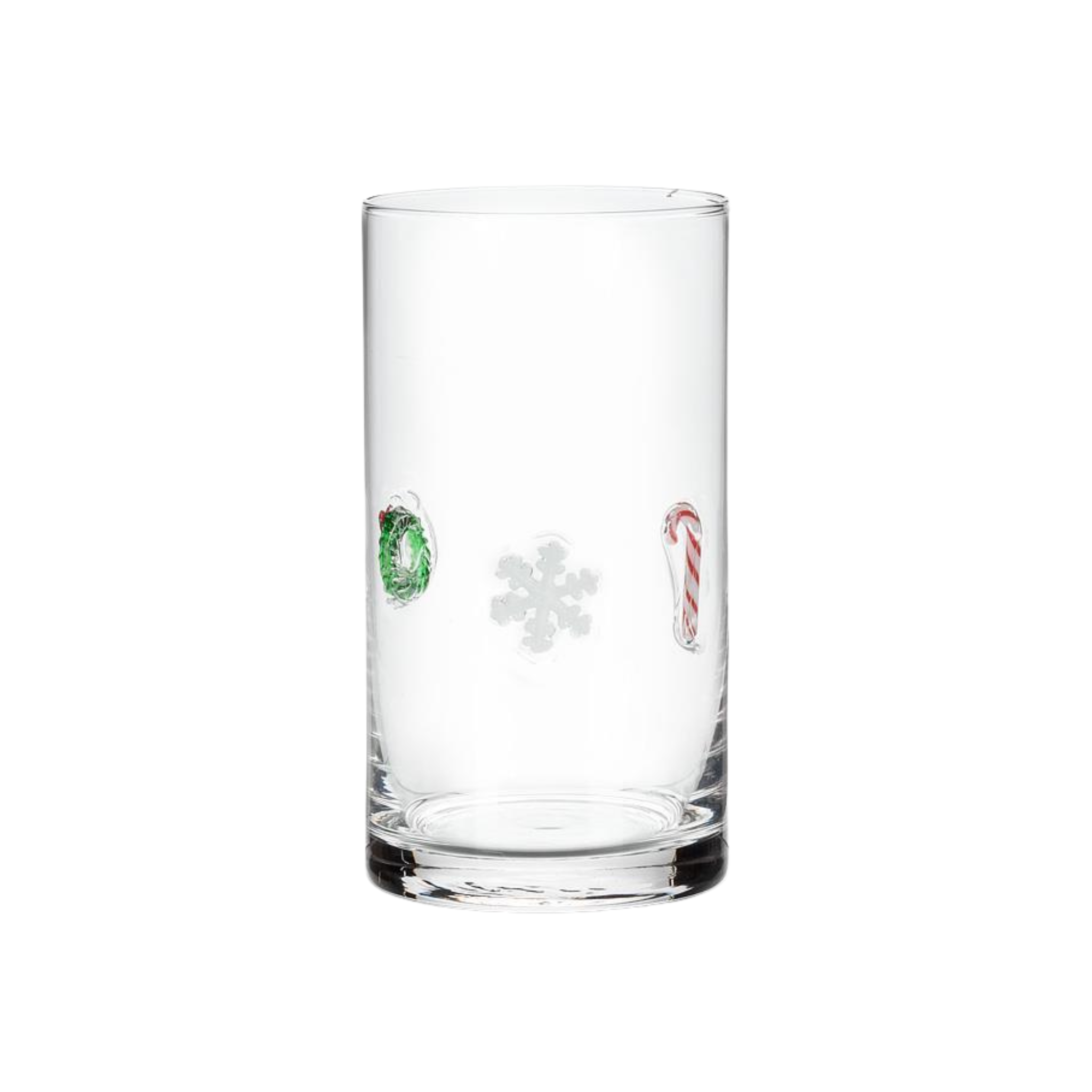 Celebrate the holiday season with this festively designed glass. Made of glass, it has an ergonomic shape that makes it easy to hold and is decorated with embossed seasonal motifs, such as candy canes and fir trees, for a stylish toast.