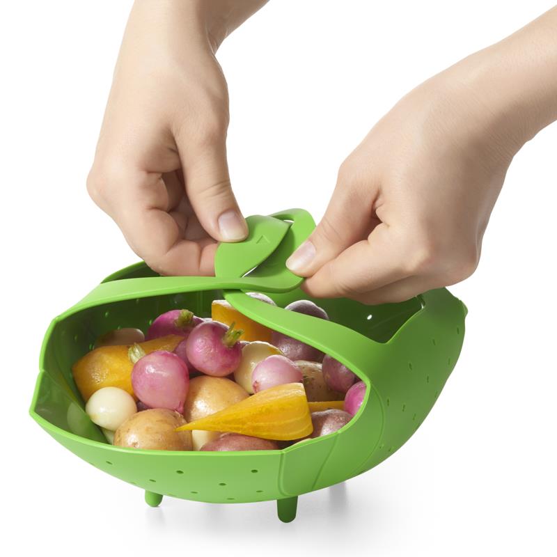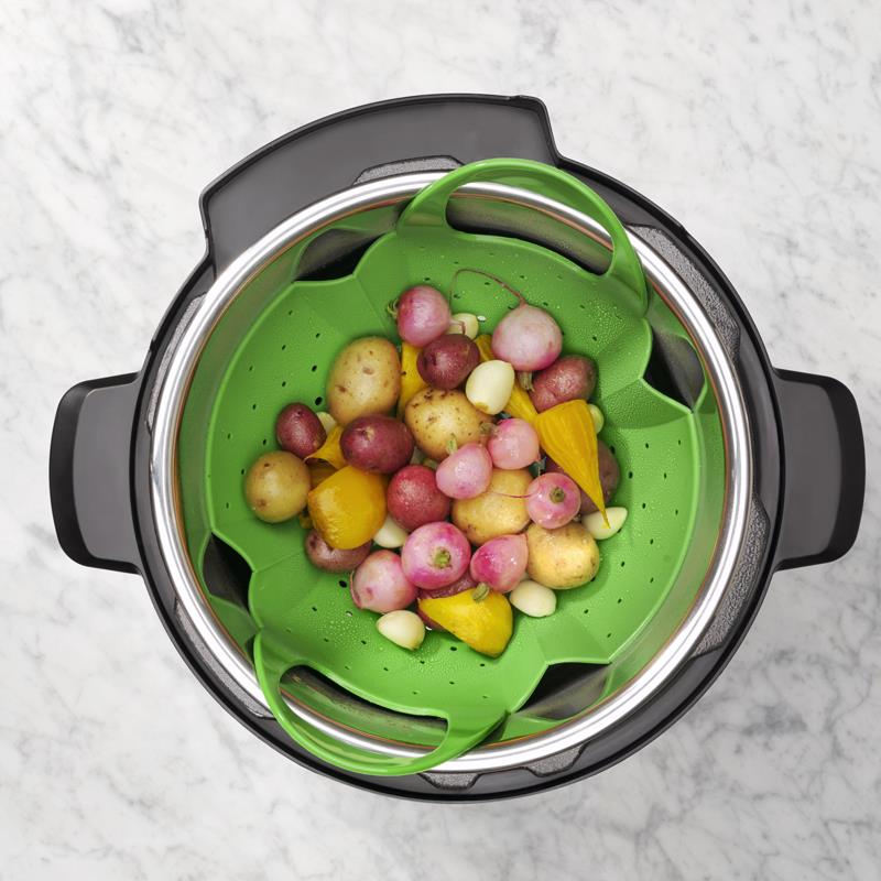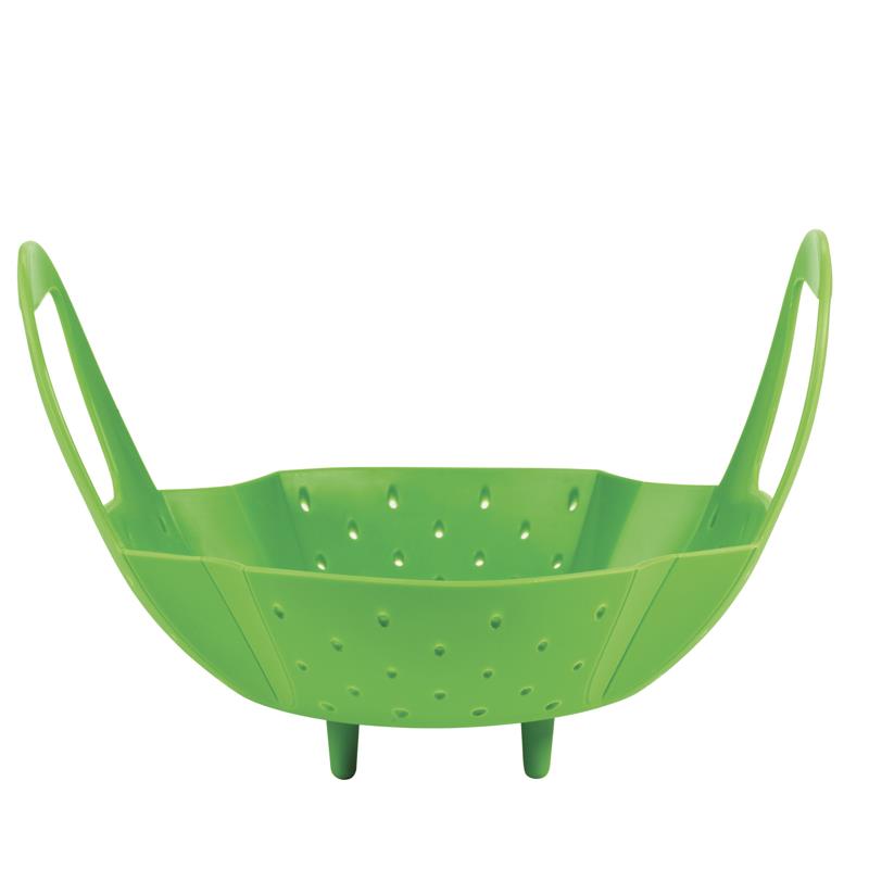 Autocuiseur à vapeur, 13 x 9 x 6,5" / 33 x 23 x 16,5 cm, vert, silicone. Les parois hautes gardent le contenu contenu et loin de l'eau bouillante. Les plis s'adaptent aux casseroles d'un diamètre de 7" ou plus. La grande capacité avec fond plat convient aux gros articles tels que les filets de poisson. Les poignées restent froides pour permettre un transfert stable des aliments. Résistant à la chaleur jusqu'à 600øF / 315§C. Les poignées flexibles se replient vers l'intérieur et se verrouillent en place permettant l'utilisation de couvercles sur les pots. Le cuiseur vapeur s'enroule pour un rangement compact.