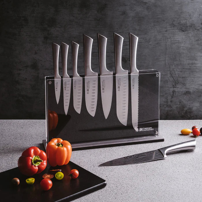 - L'ensemble de 9 blocs de couteaux Nami Cuisine::pro® Damashiro® contient : 1 couteau de chef 20 cm/8", 1 couteau à pain 20 cm/8", 1 couteau Santoku 17 cm/6,5", 1 couteau Santoku 14 cm/5,5" Couteau, 1 mini couteau de chef de 15 cm/6", 1 couteau Santoku de 12,5 cm/5", 1 couteau utilitaire de 12 cm/4,5", 1 couteau d'office de 9 cm/3,5". Logé dans un superbe bloc avec des fenêtres latérales pour montrer les lames distinctives inspirées de Damas.
