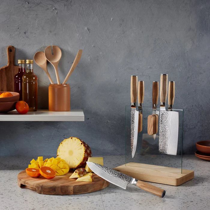 - Le bloc de 7 couteaux Cuisine::pro® Damashiro® Emperor Hikari contient : 1 couteau de chef 20 cm/8", 1 couteau couperet 17 cm/6,5", 1 couteau à découper 20 cm/8", 1 couteau Santoku 14 cm/5,5" Couteau, 1 couteau utilitaire de 12 cm/4,5" et 1 couteau d'office de 9 cm/3,5" logés dans un bloc de couteaux en verre trempé.