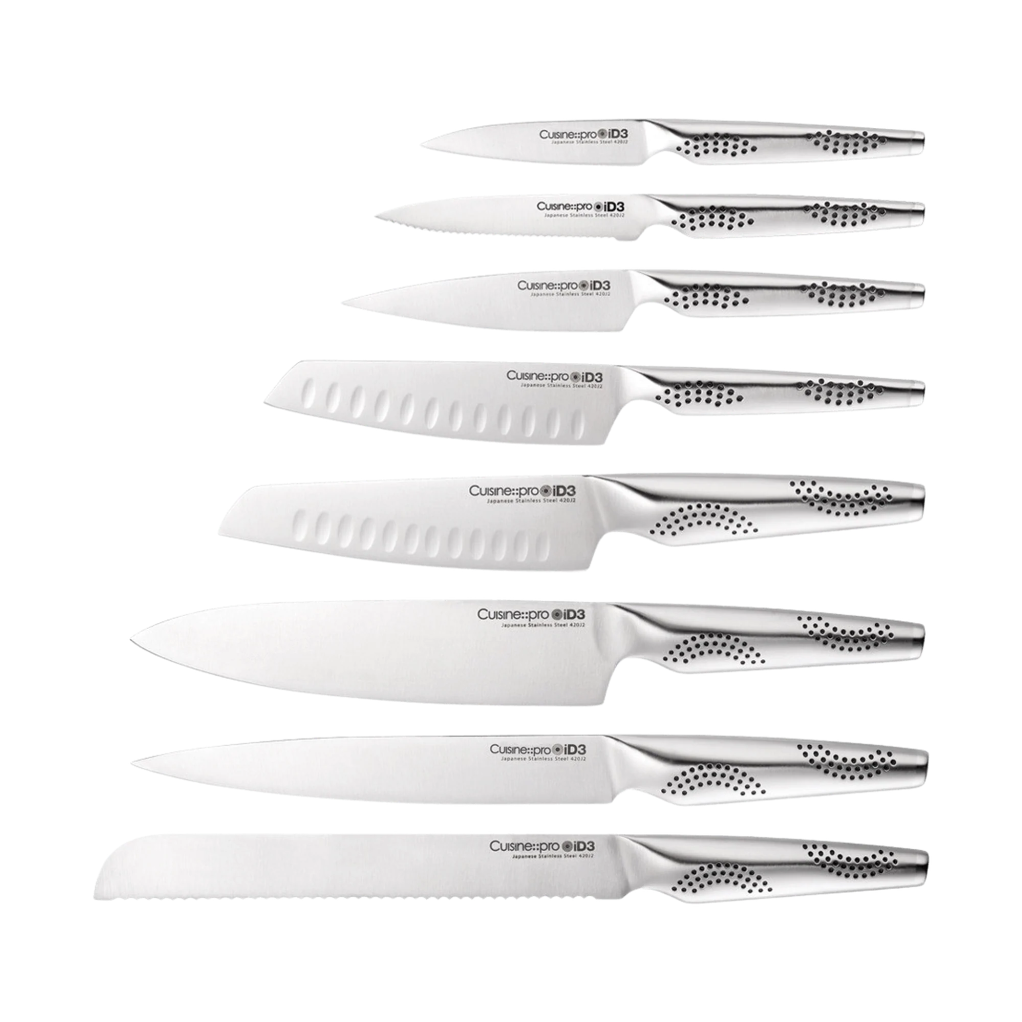 La collection iD3® se distingue par sa construction monobloc en acier inoxydable, son manche creux lesté pour un équilibre parfait, et sa technologie MicroDot® qui améliore l’adhérence et le confort pendant la coupe.