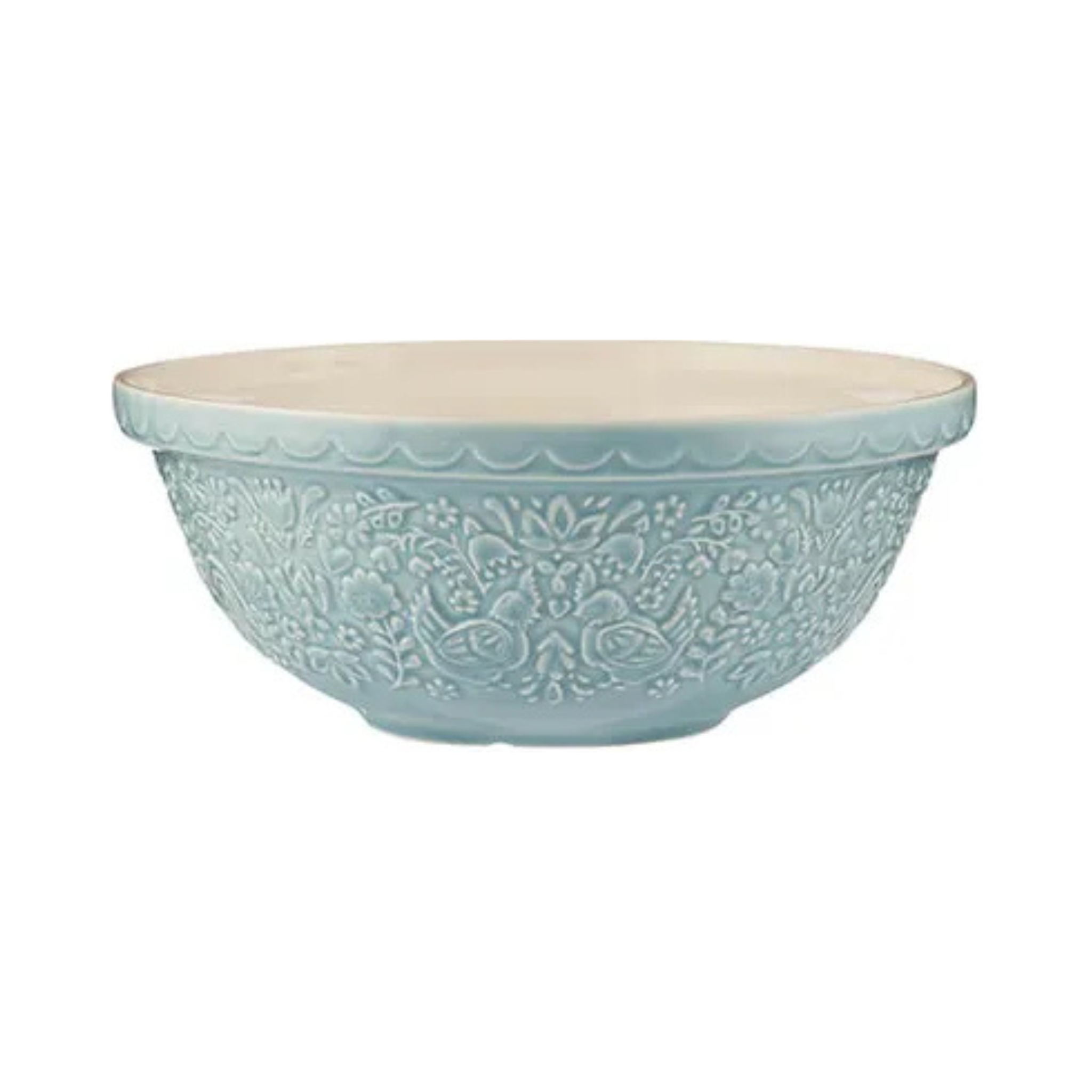 Apportez une touche de gaieté à votre cuisine avec ce bol à mélanger bleu, décoré de motifs de poules et de fleurs embossés, inspirés de la campagne.