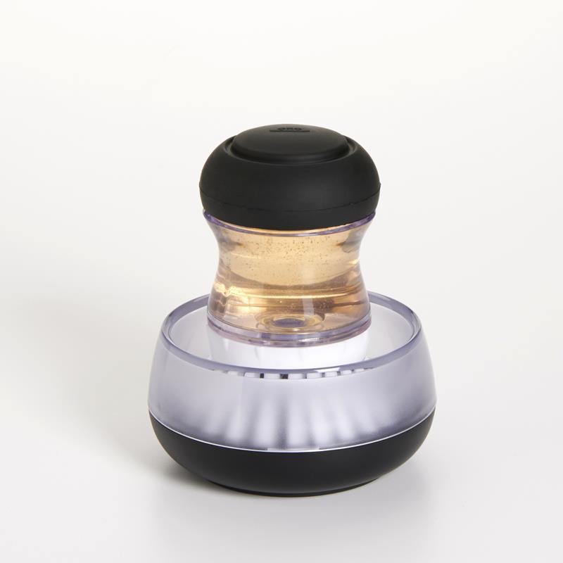 Brosse distributrice de savon Palm, avec base de rangement, 5,75 po / 14,5 cm, poils en nylon. La brosse distribue le savon en appuyant légèrement sur un bouton. La brosse est dotée de poils en nylon durables. Les poils sont sans danger pour les ustensiles de cuisine antiadhésifs. Le support retient parfaitement les gouttes d'eau Base antidérapante