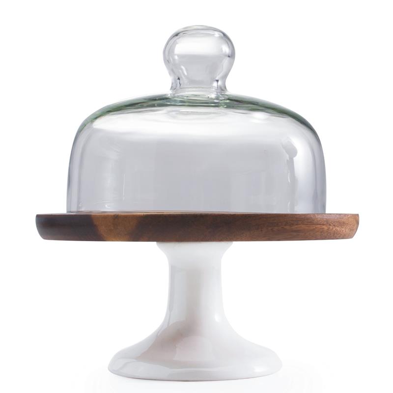 Plateau à fromage avec dôme en verre, 7,75 "/ 19,5 cm de diamètre, porcelaine et acacia. La vaisselle de service Chalet Chic combine le raffinement de la porcelaine blanche avec l'attrait rustique de l'acacia.