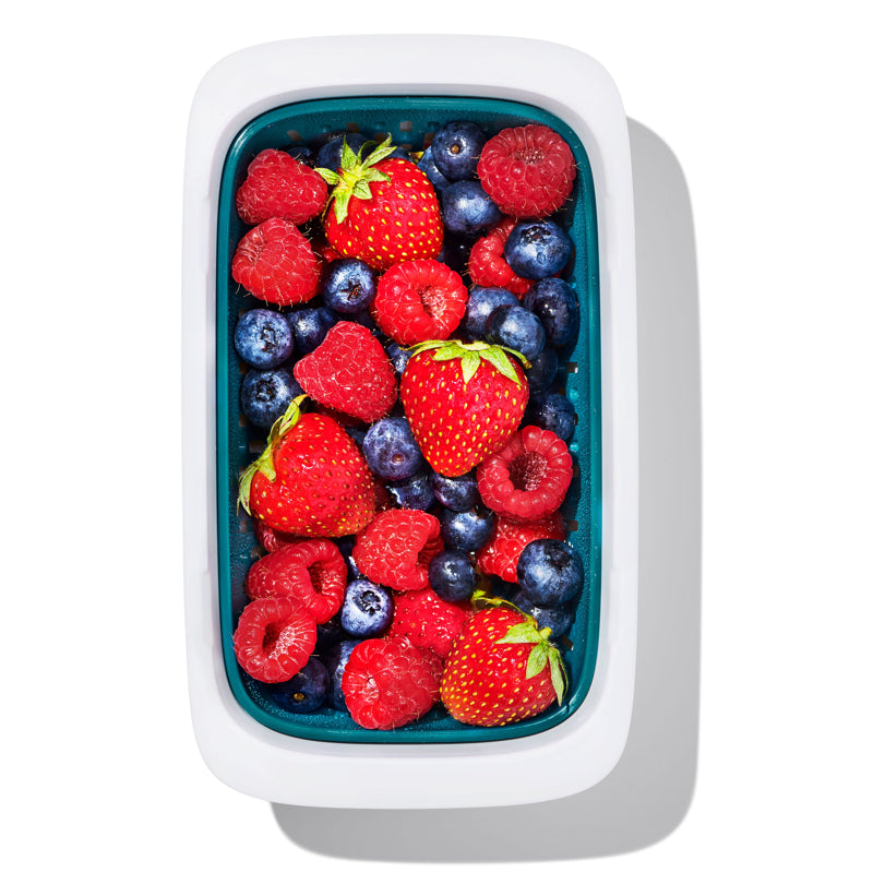 Contenant avec passoire, 450 mL (1,9 tasse). Ce combo de contenants est idéal pour les collations saines de fruits et de légumes. Les fruits et légumes peuvent être rincés dans la passoire amovible, puis la passoire replacée dans le récipient pour une consommation sur le pouce. La passoire est surélevée pour que l'eau de ruissellement ou le jus se trouve au fond et ne touche pas les aliments. Le couvercle transparent et étanche est doté d'un joint en silicone et de deux clips de verrouillage pour une étanchéité sûre. Le joint en silicone est amovible pour un nettoyage en profondeur. Le conteneur mesure : 17,8 x 11,4 x 7 cm (7" x 4,5" x 2,8").