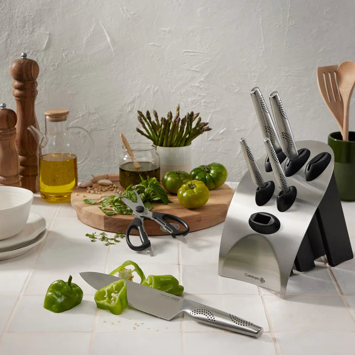 Le bloc de couteaux exclusif Cuisine::pro® iD3® Tora 7 pièces est fabriqué selon les normes exigeantes des chefs professionnels. Il comprend cinq couteaux fins et légers et une paire de ciseaux de cuisine, qui ont été conçus pour une expérience de hachage et de tranchage extrêmement rapide et agile.