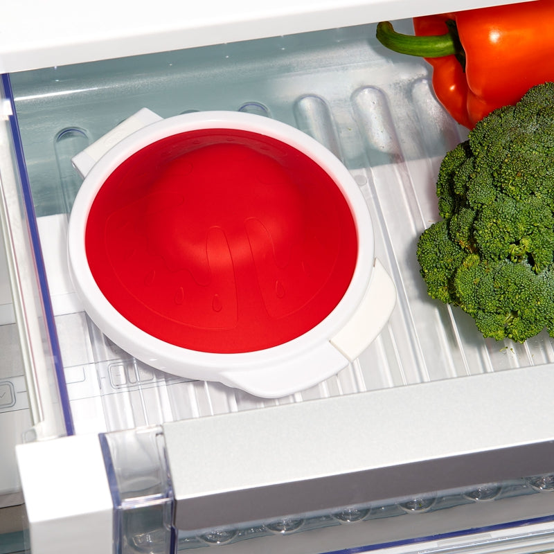 Ce contenant de rangement réutilisable conserve les aliments coupés frais au réfrigérateur. Élimine le besoin des pellicules, des sacs en plastiques et des emballages en aluminium à usage unique. Le silicone flexible se plie pour s'adapter à différentes formes et tailles d'oignons et autres aliments similaires.