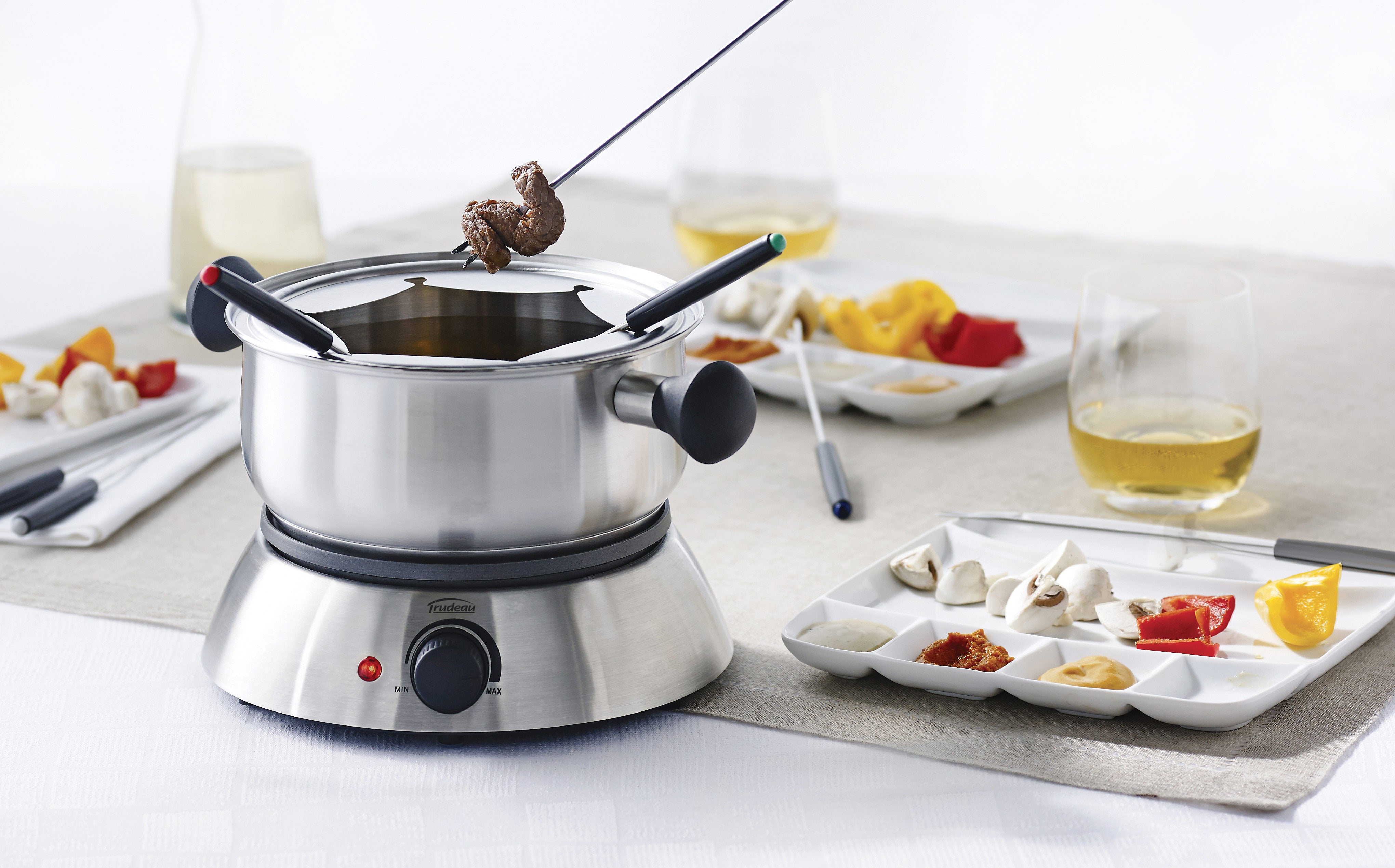 Ensemble à fondue électrique 3 en 1 conçu pour tous les bouillons, le fromage et le chocolat. De Trudeau Maison, elle comprend un caquelon en acier inoxydable ainsi qu’un bain-marie en grès de céramique. D’une puissance de 1500 watts, six (6) fourchettes et un guide de recettes y sont aussi inclus.