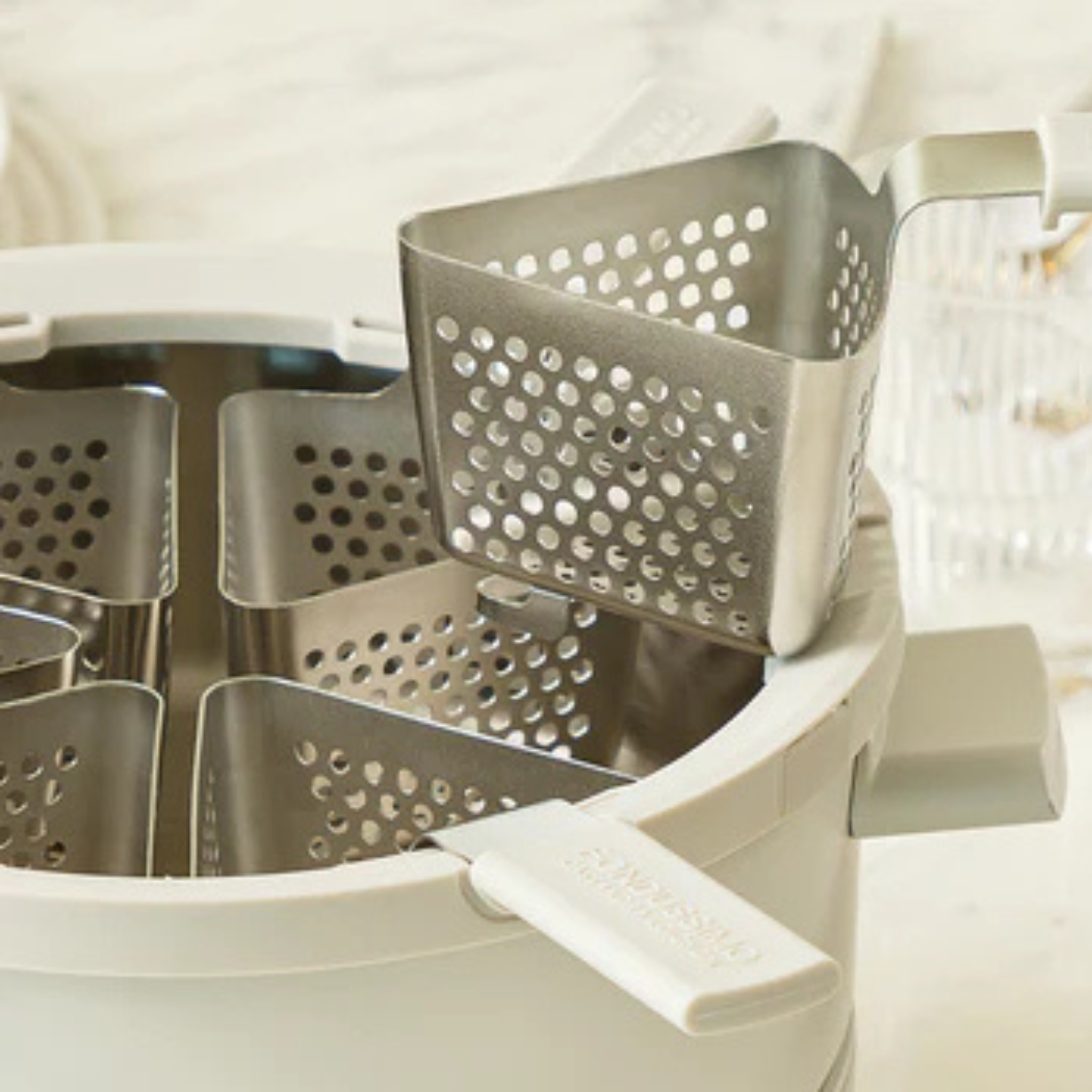 - Accessoires inclus : 6 paniers perforés, 6 pinces, chaudron, base électrique, bol pour bain-marie, câble d’alimentation