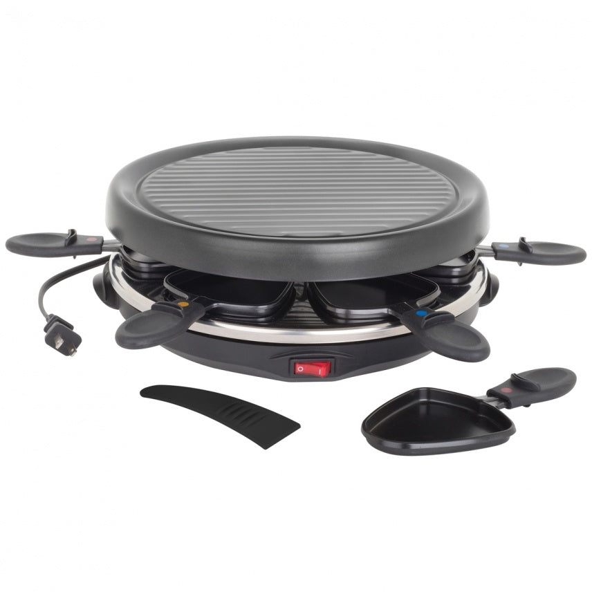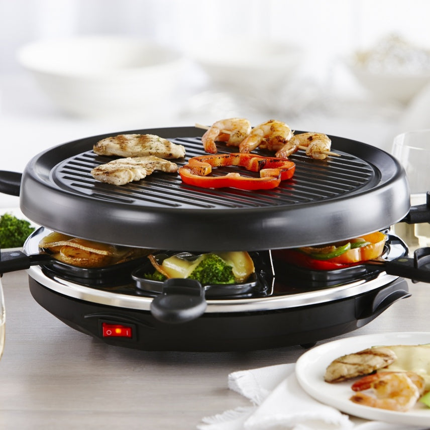 Préparez une fête grâce à l'esemble à raclette Misto. Buf, poulet, fruits de mer ou saucisses, vous pouvez tout faire avec cette raclette ! L'ensemble à raclette Misto possède une plaque ronde et plate en acier estampé avec un témoin d'alimentation lumineux. La raclette vient avec 6 racloirs et 6 poêlons antiadhésifs avec des poignées restant tempérées et embouts de couleurs assorties.