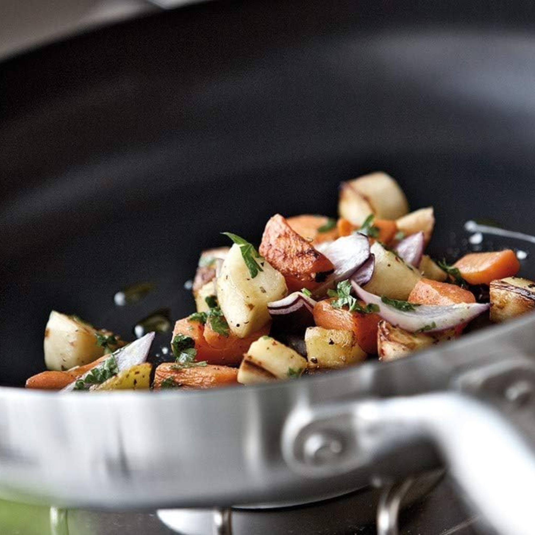 Cet ensemble de deux poêles à frire de la série CTX allie performance professionnelle et design élégant. Leur construction en aluminium moulé à cinq couches avec un revêtement en acier inoxydable permet une répartition rapide et uniforme de la chaleur, tout en assurant une excellente rétention. La surface antiadhésive brevetée STRATANIUM est sans danger pour les ustensiles métalliques et permet une cuisson saine avec peu d’huile.