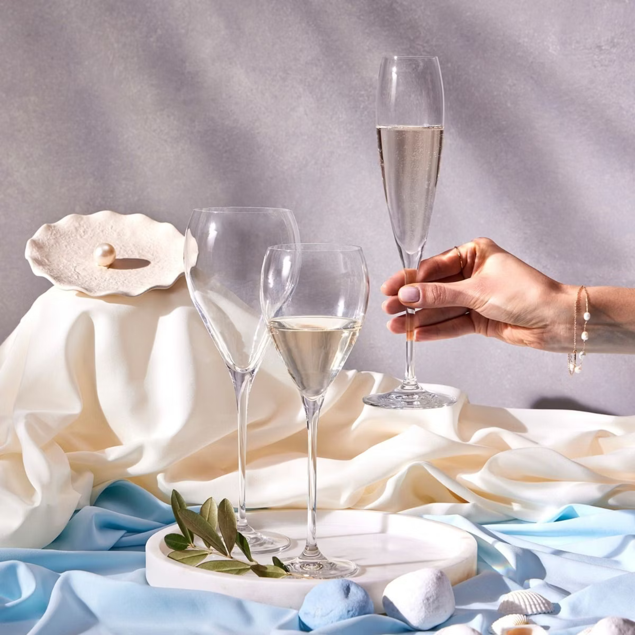 Leur forme en cloche élancée permet au champagne de s’écouler délicatement le long des parois, offrant une vue parfaite sur les bulles qui montent. Fabriqués en verre Crystalline de haute qualité, ces verres garantissent une transparence parfaite, une brillance éclatante et une résistance durable. Ils peuvent être utilisés aussi bien pour des occasions spéciales que pour des moments privilégiés du quotidien avec vos proches.