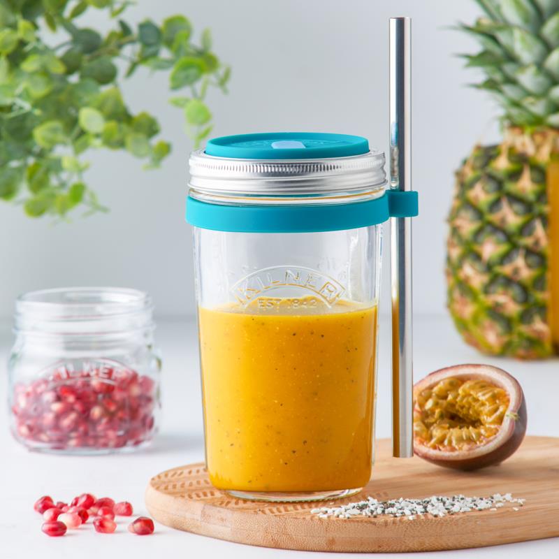 Ensemble de pots à smoothie, 500 ml, verre. Créez des smoothies maison, du thé glacé, des jus ou d'autres boissons froides et transportez-les en toute simplicité. Une protection antiéclaboussures pratique vous permet de mélanger directement à l'intérieur du pot. La paille en acier inoxydable durable a une large ouverture adaptée aux mélanges plus épais, tandis que le support en silicone innovant maintiendra la paille en place lorsqu'elle n'est pas utilisée. L'ensemble comprend un bocal en verre à large ouverture de 500 ml, un couvercle en silicone, un pare-éclaboussures, un porte-paille et une paille à smoothie en acier inoxydable. Mode d'emploi et une délicieuse recette de smoothie inclus.