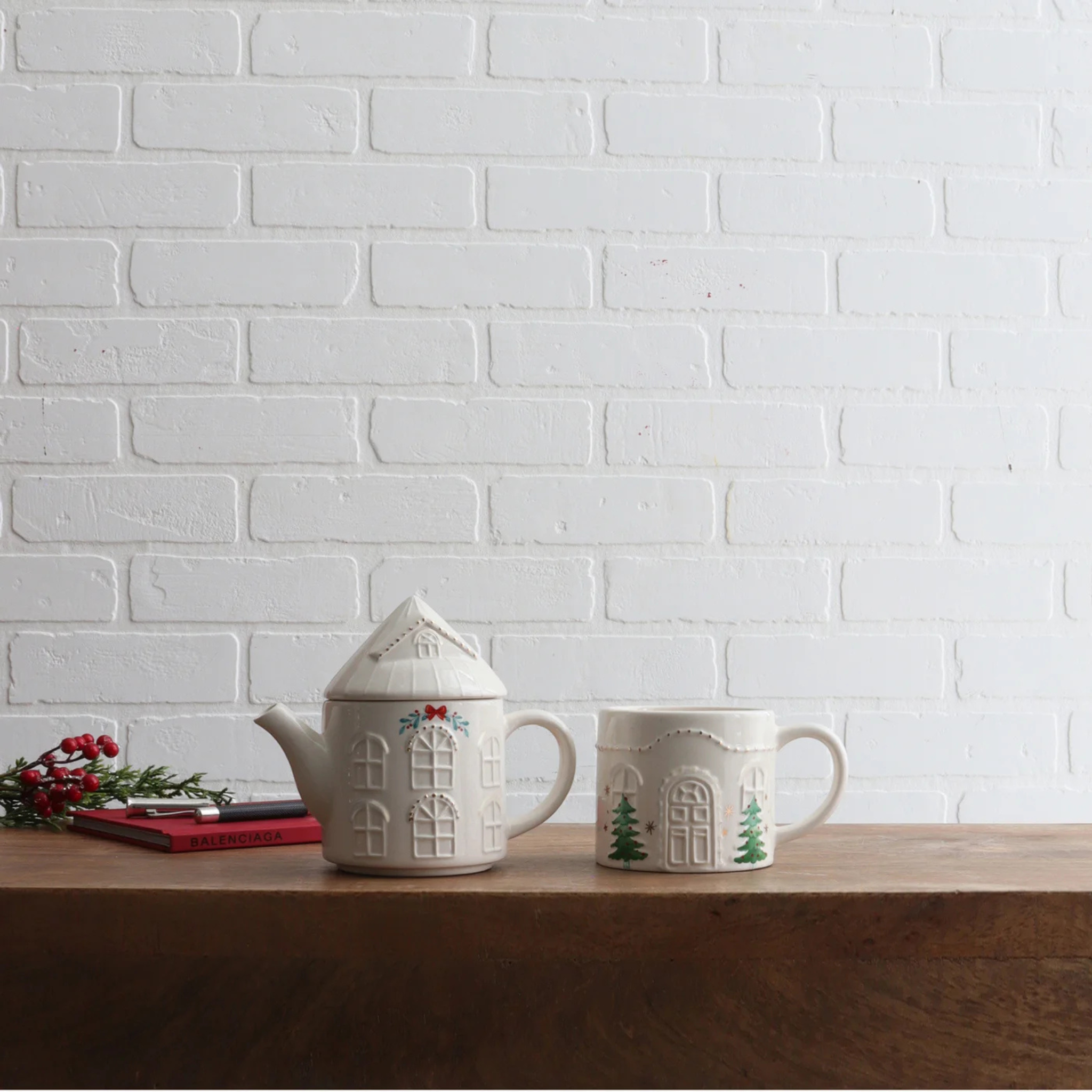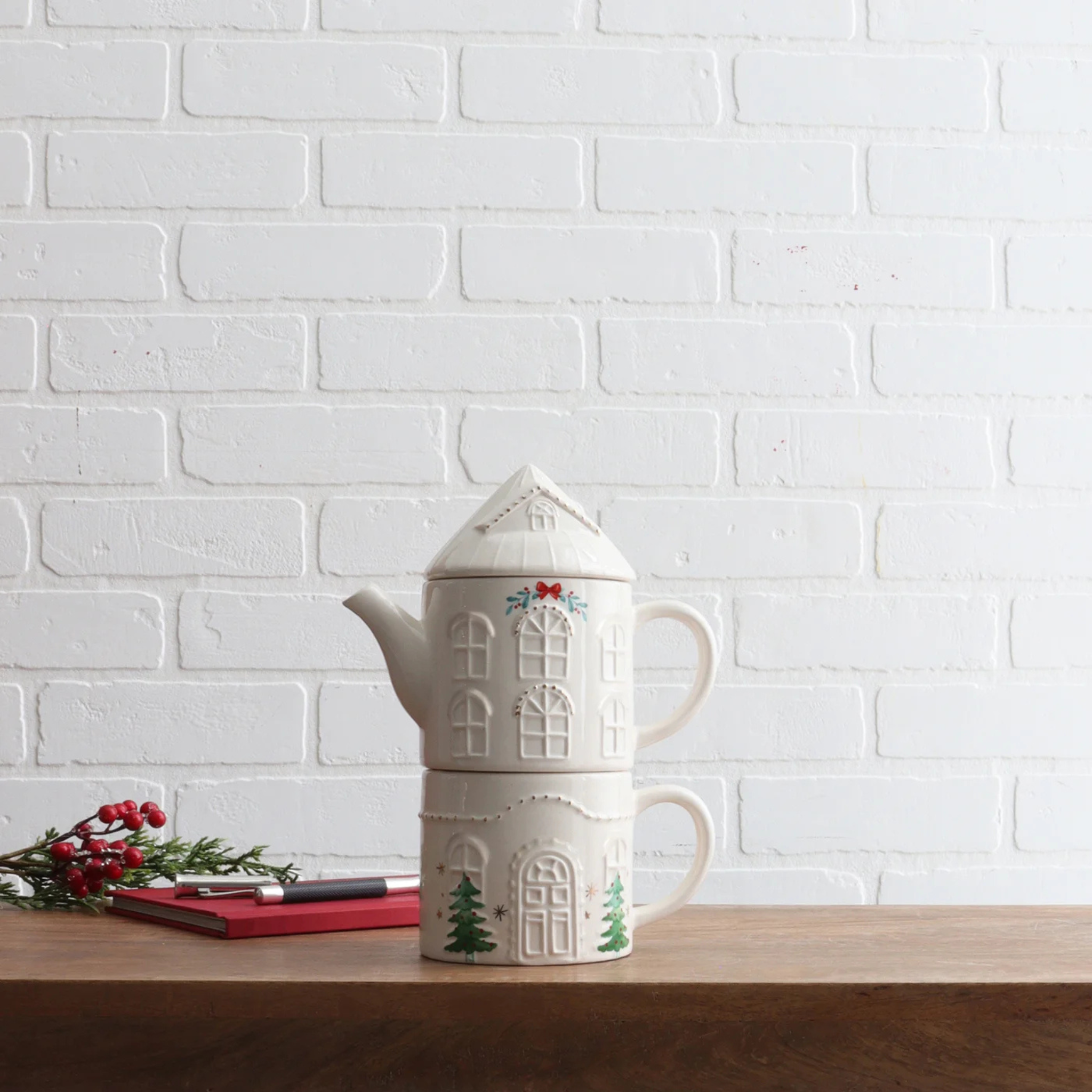Ensemble théière empilable & tasse Maison de Noël Blanche