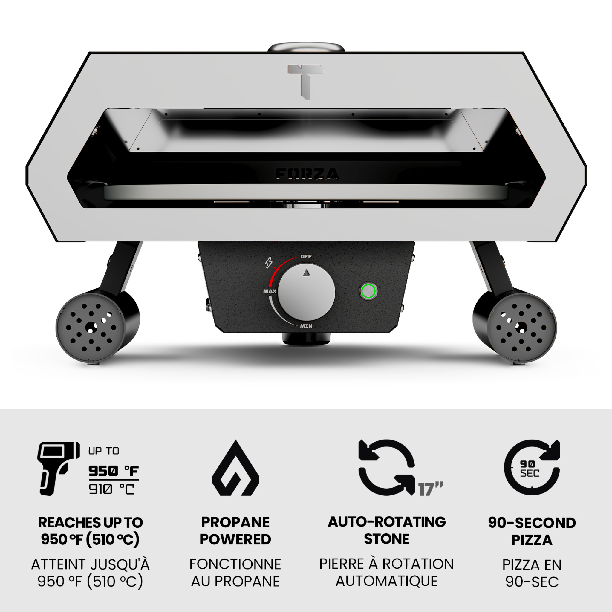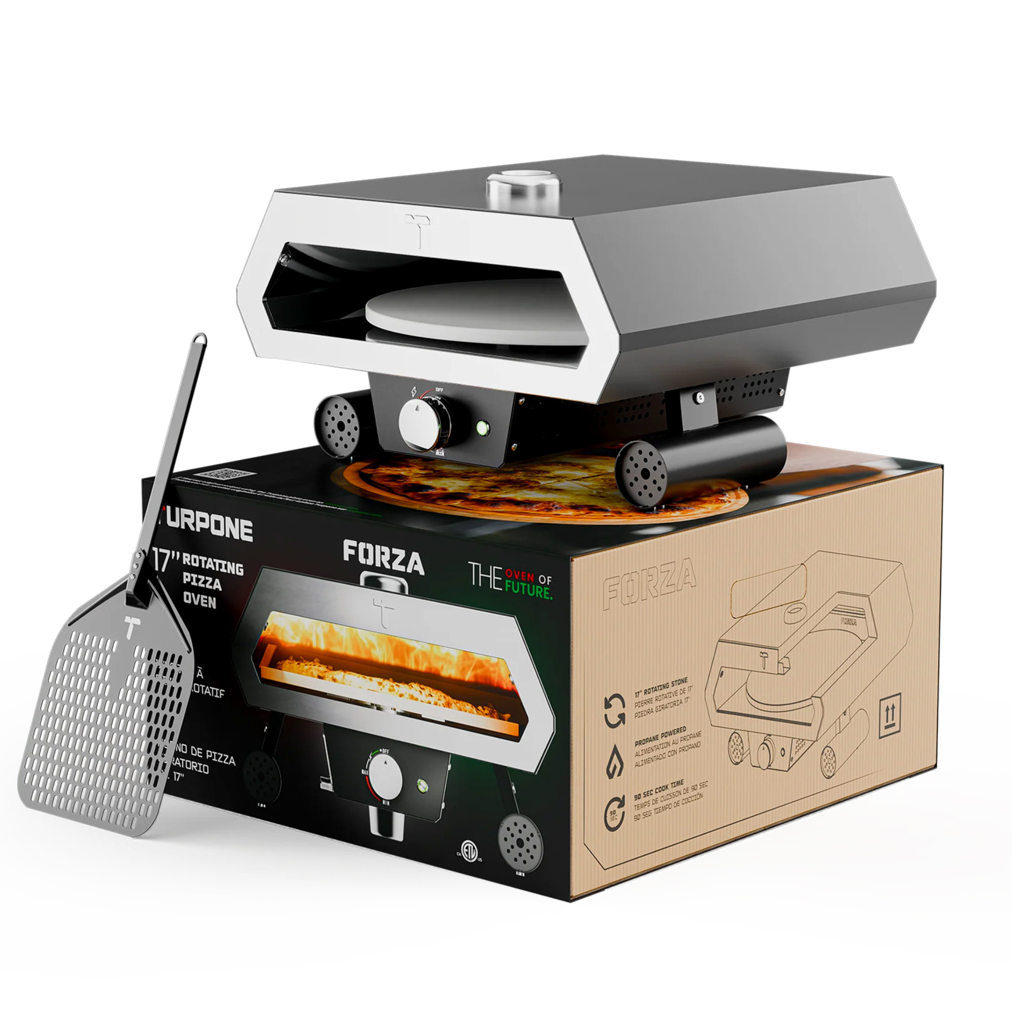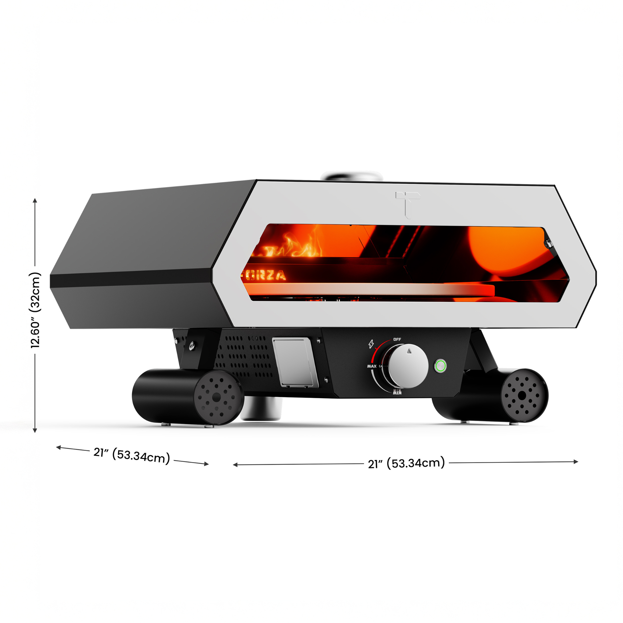 Four à pizza compact et performant atteignant 510 °C pour cuire une pizza de 17 po en 90 secondes. La pierre en cordiérite tourne automatiquement grâce à un moteur à piles pour une cuisson uniforme. Le thermomètre intégré permet un contrôle précis de la chaleur. Construction durable avec pierre résistante aux chocs et design pensé pour l’extérieur. Inclut une pelle à pizza perforée en aluminium assortie.