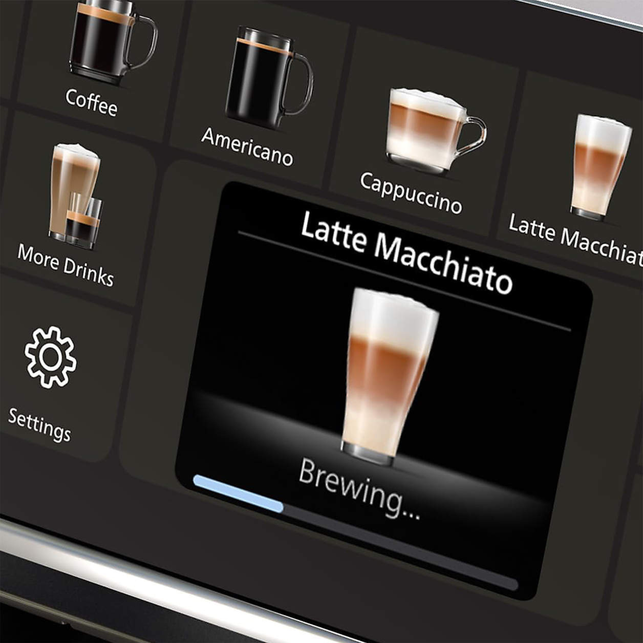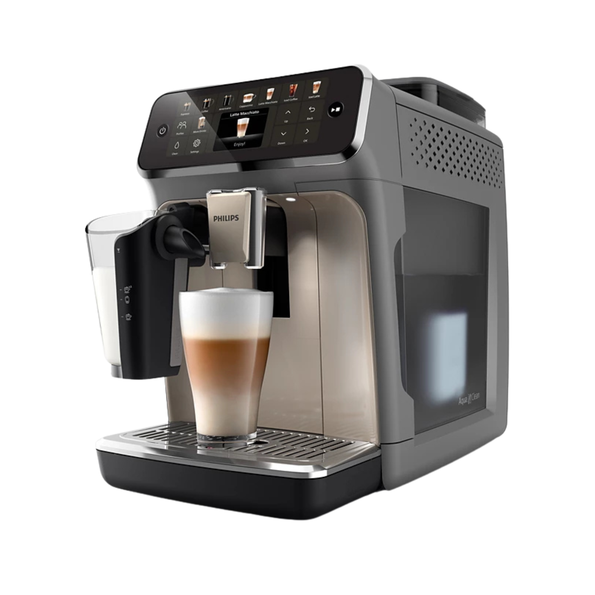 Machine espresso entièrement automatique offrant 20 boissons chaudes et glacées, incluant espresso, cappuccino, latte macchiato, boissons glacées et plus encore. Le système LatteGo crée une mousse de lait soyeuse et se nettoie en quelques secondes grâce à ses deux pièces sans tuyaux. L’écran TFT intuitif permet de sélectionner, personnaliser et enregistrer vos recettes préférées dans 4 profils utilisateurs plus un profil invité. La technologie SilentBrew réduit le bruit jusqu’à 40 %, tandis que la fonction QuickStart permet de préparer un café dès l’allumage. Le broyeur 100 % céramique offre 12 niveaux de mouture. Le filtre AquaClean permet jusqu’à 5000 tasses sans détartrage lorsqu’il est remplacé selon l’indication.