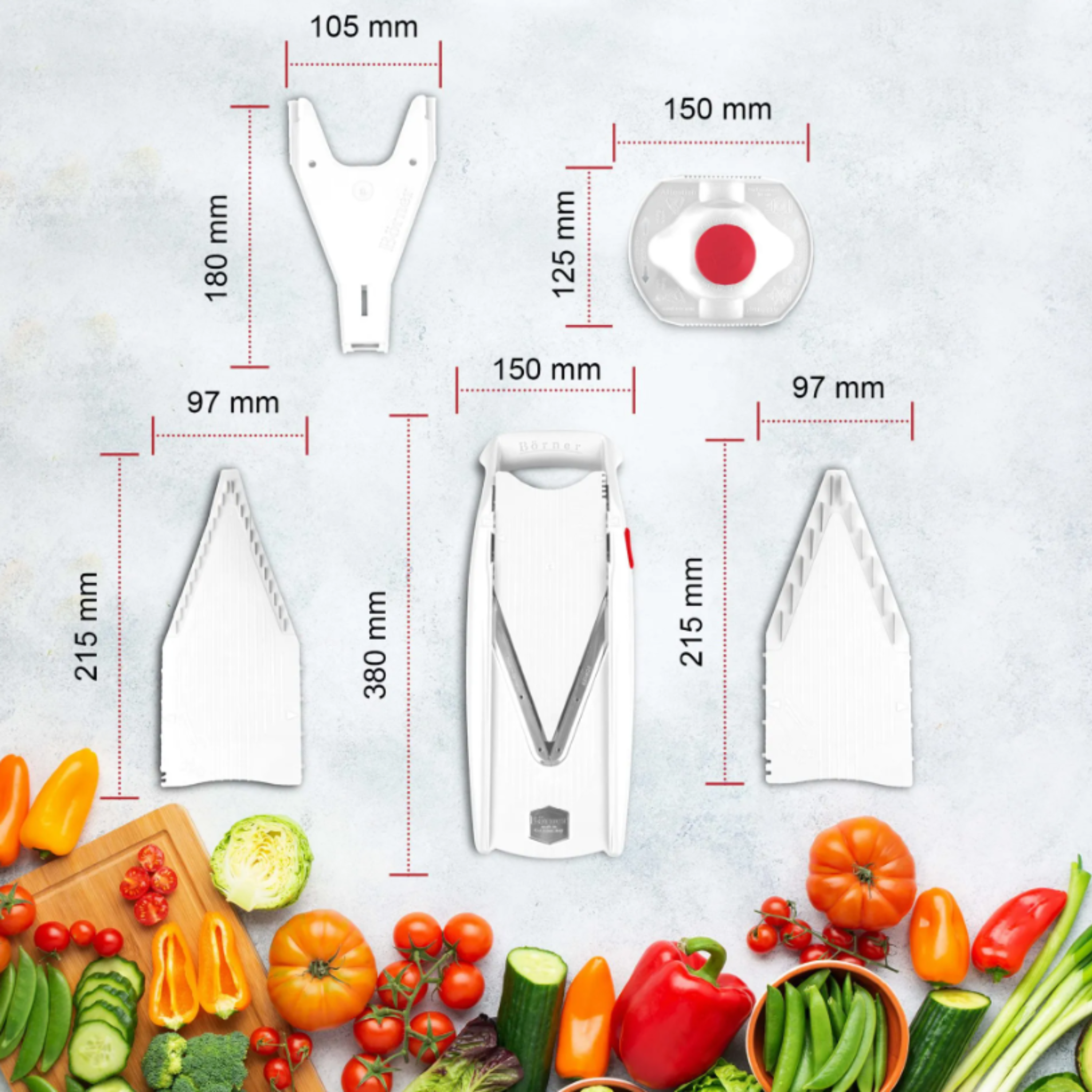 La mandoline V5 PowerLine de Borner, fabriquée en Allemagne, permet de trancher facilement fruits et légumes, qu’ils soient fermes ou tendres. Grâce à ses lames extrêmement tranchantes et ses inserts réglables, vous pouvez ajuster l’épaisseur de coupe selon vos besoins. Son manche ergonomique et son porte-aliment de sécurité assurent une utilisation confortable et sécuritaire.