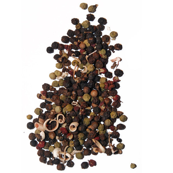 Ce mélange parfumé et mordant est né de l'idée d'Ethné de marier un poivre classique à son nouveau favori, le poivre Andaliman. Ce petit poivre indonésien, doté d'un riche parfum d'agrumes, a d'abord été combiné à nos meilleurs poivres verts et noirs. Nous y avons ensuite ajouté juste ce qu'il faut de poivre de Sichuan et de citronnelle, et nous ne sommes pas peu fiers du résultat. À utiliser bien entendu avec les poissons et fruits de mer, mais aussi dans les plats de volaille, les vinaigrettes... partout où l'on mettrait du citron!