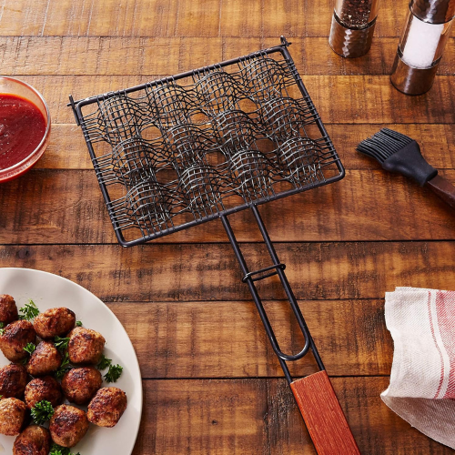 Imaginez cuire des boulettes de viande sur le grill, en les gardant entières et en les cuisant uniformément. Avec ce panier à boulettes, vous pouvez griller vos boulettes tout en les maintenant fermement en place grâce au mécanisme de verrouillage du panier. Cela vous permettra de retourner facilement les boulettes au-dessus des flammes ouvertes. Avec une construction tressée conçue pour éliminer l'excès de graisse, le panier grille jusqu'à 12 savoureuses boulettes de viande sans compromettre la saveur. Il est doté d'un revêtement antiadhésif de haute qualité qui ne contient ni PTFE ni PFOA, ainsi que de longues poignées en bois de rose pour un retournement facile et sécuritaire. Un moyen sûr d'ajouter du piquant à votre barbecue.
