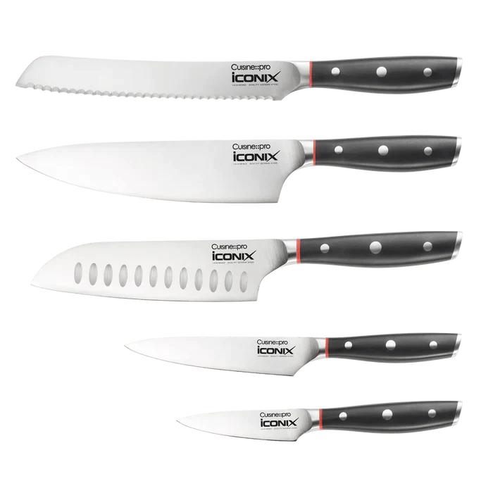 - Le bloc de 6 couteaux Cuisine::pro® iconiX® Holz contient : 1 couteau d'office de 9 cm/3,5", 1 couteau utilitaire de 12 cm/4,5", 1 couteau Santoku de 18 cm/7", 1 couteau à pain de 20 cm/8" et 1 couteau de 20 cm/ Couteau de chef de 8 po. Logé dans un élégant bloc de couteaux en bois d'acacia pour mettre en valeur vos lames.
