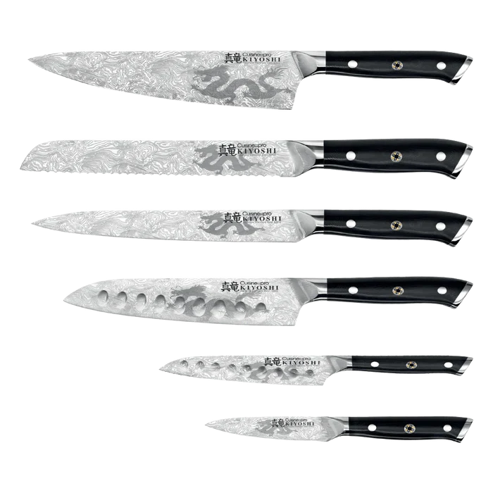 IDENTIFICATION DE LA MARQUELa gamme Cuisine::pro KIYOSHI ™ de THE CUSTOM CHEF ™ comprend des lames distinctives inspirées de Damas inspirées par les artisans japonais traditionnels et les fabricants d'épées de samouraï, caractéristiques des bandes et des marbrures rappelant l'eau qui coule. Chaque lame porte également un insigne Dragon distinctif.