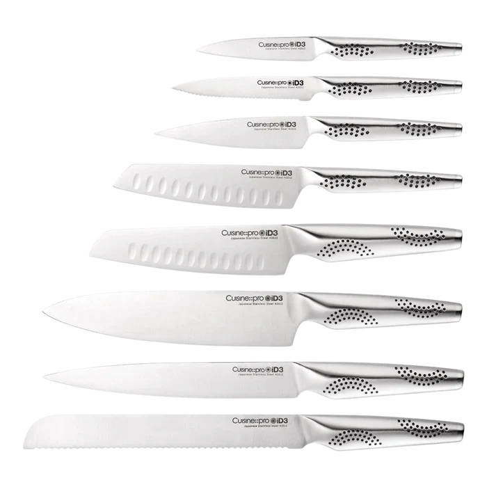 - Le bloc de 9 couteaux Cuisine::pro® iD3® THE EGG contient : 1 couteau d'office de 9 cm/3,5", 1 couteau utilitaire dentelé de 10 cm/4", 1 couteau utilitaire à bord droit de 11 cm/4", 1 x 12,5" Couteau Santoku cm/5", 1 couteau Santoku 15 cm/6", 1 couteau de chef 20 cm/8", 1 couteau à découper 20 cm/8" et 1 couteau à pain 20 cm/8". THE EGG est la pièce incontournable de KITCHEN BLING !