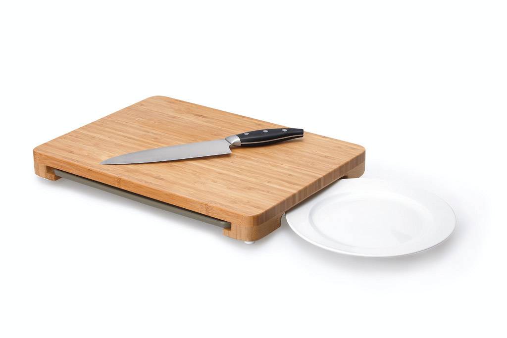 Cette planche à découper en bois de bambou RICARDO vient avec une planche antibactérienne intégrée qui se range facilement sous la planche principale. Sa forme permet de couper les aliments et de dégager la surface en glissant une assiette sous les poignées latérales.